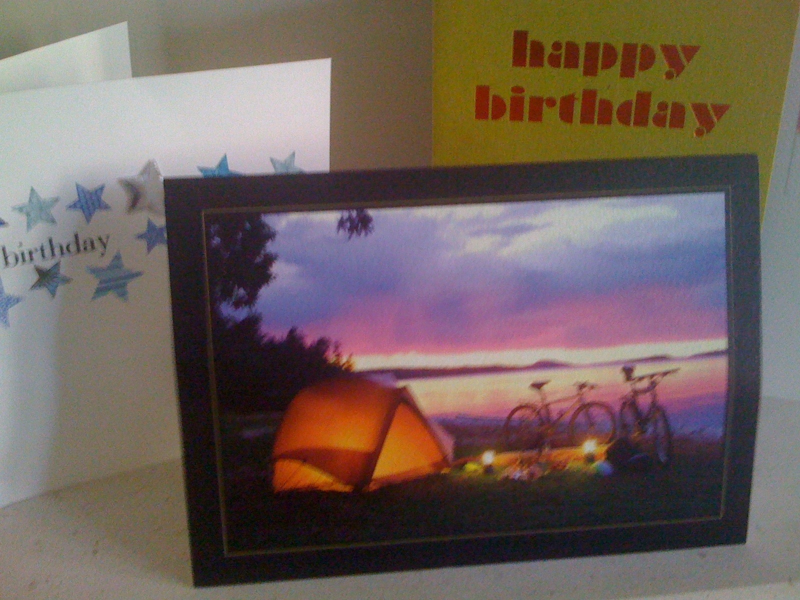 It’s been rather a quite birthday, worked part of the day but finished around 2pm and have mooched around not doing very much. It was an indulgent treat to be able to have a little afternoon siesta, it made me think that introducing a day bed in the office wouldn’t be such a bad idea. Had a nice pile of lovely birthday cards to open this morning, including this very apt one featuring a touring cyclist’s camp from Jean and Syd. This will be us in just over three weeks, (minus the tent), looking forward to lots of Pacific Ocean sunsets just like this one.
