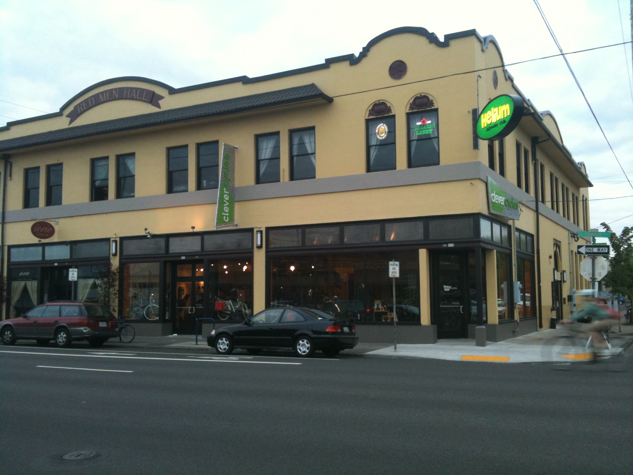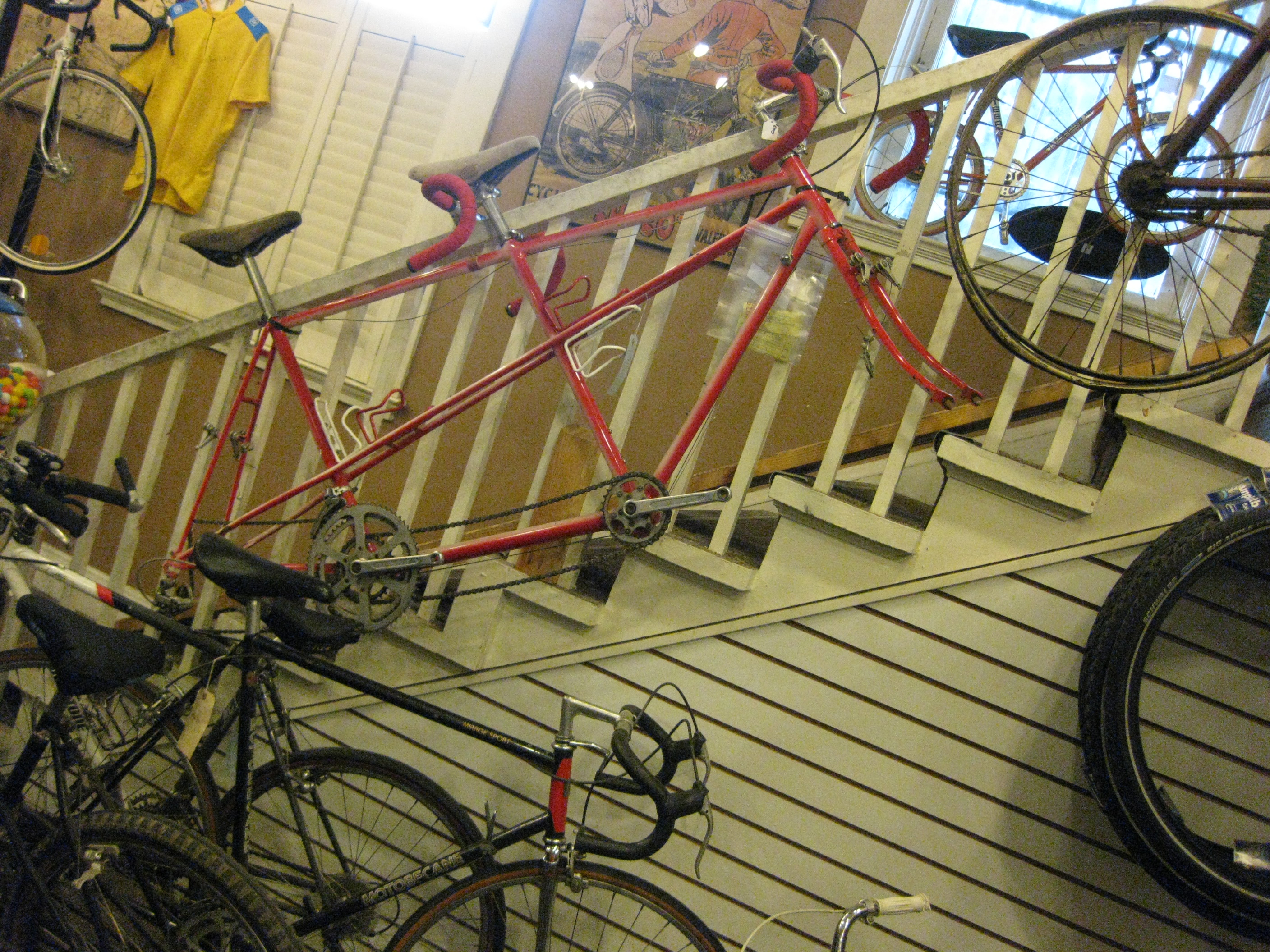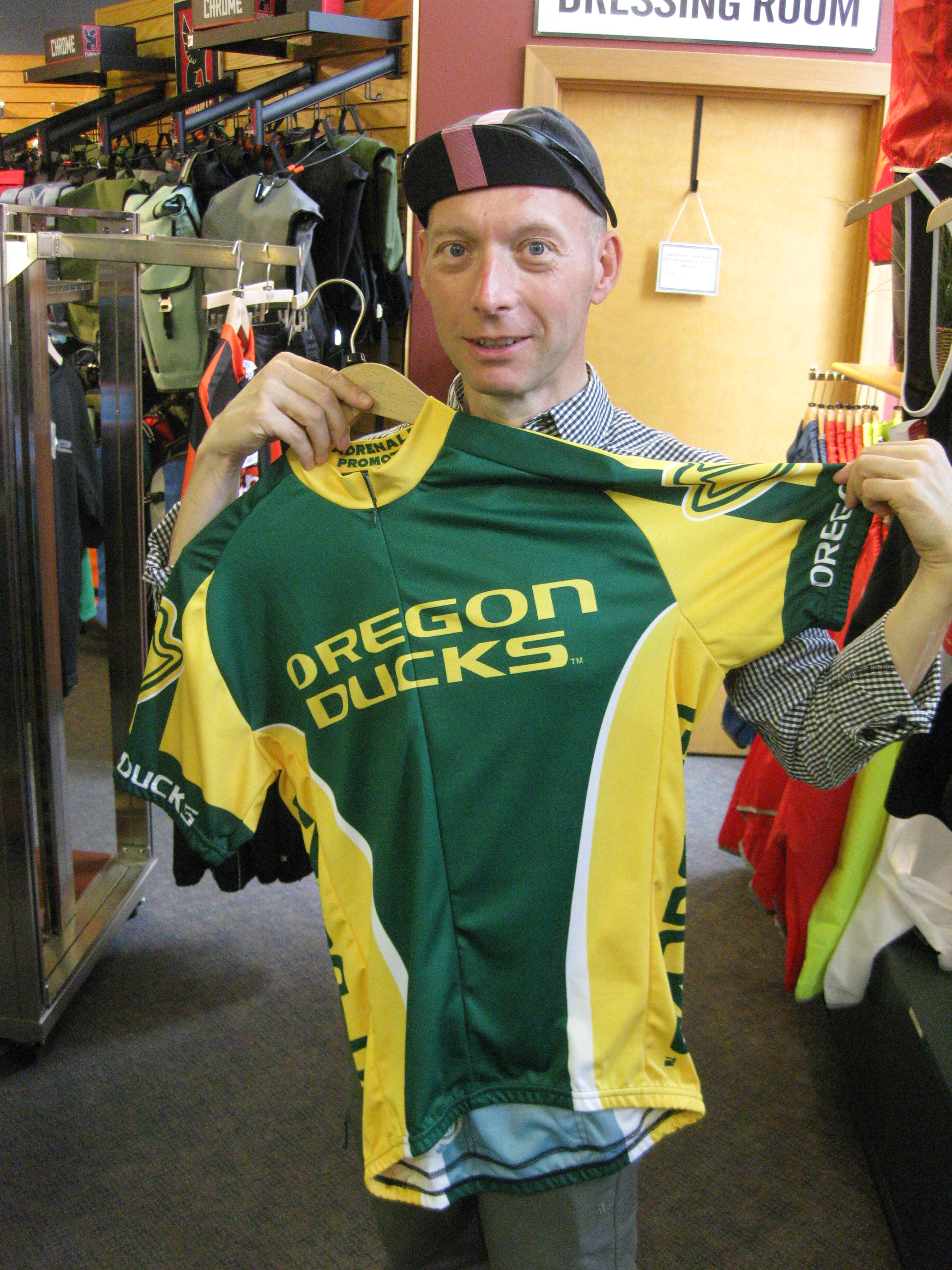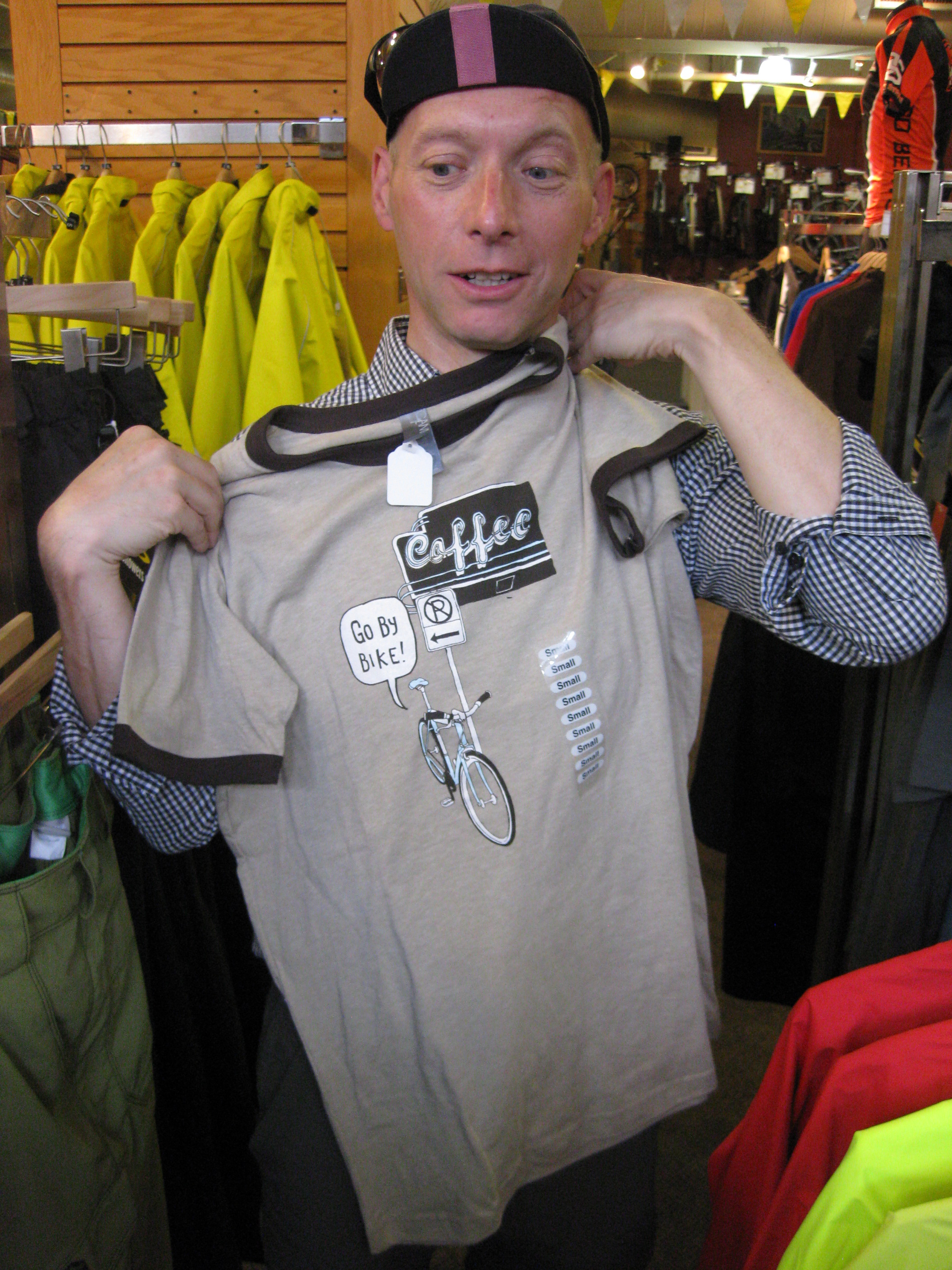 The nicest bicycle shops in Portland included the Recyclery Bicycle Shop – with lots of renovated old steel frames from the 1970s and earlier, (I spotted a lovely old Holdsworth), fancy chrome and intricate lug work. They sell for about $800-900 – our friend Andy H could make a fortune here. They also had a yellow jersey signed by Greg Lemond hanging on the wall. Very impressive! Next, the Bike Gallery, with some funny bicycle-related t-shirts, socks and local club jerseys the Oregon Ducks and Portland CC.