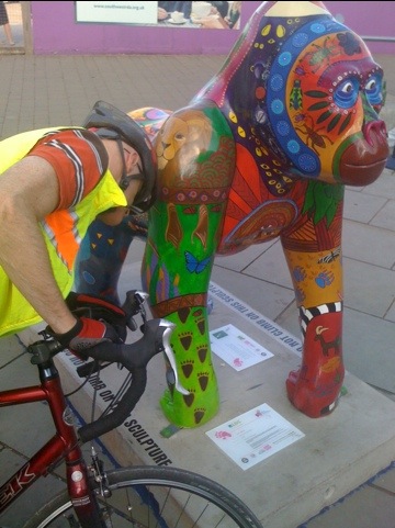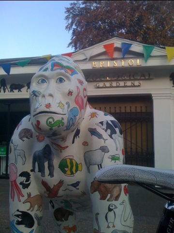 Tonight’s CycleOut Bristol bike ride, led by Chris, took us on a ‘Gorilla hunt’. On our bikes we were able to see about 25 of the 80+ painted gorilla statues that have been placed around Bristol to celebrate Bristol Zoo’s 175th anniversary. Each has been decorated by a different artist and they are proving to be quite this summer’s tourist attraction – definitely worth a visit. Sadly I couldn’t persuade Mike to join tonight’s ride. I think he’d have enjoyed it, (especially if he’d known we’d be cycling past Waitrose in Westbury Park!). Finishing off with tea at the Tobacco Factory where there is an additional mini gorilla in the bar, courtesy of Ashton Gate Primary School.