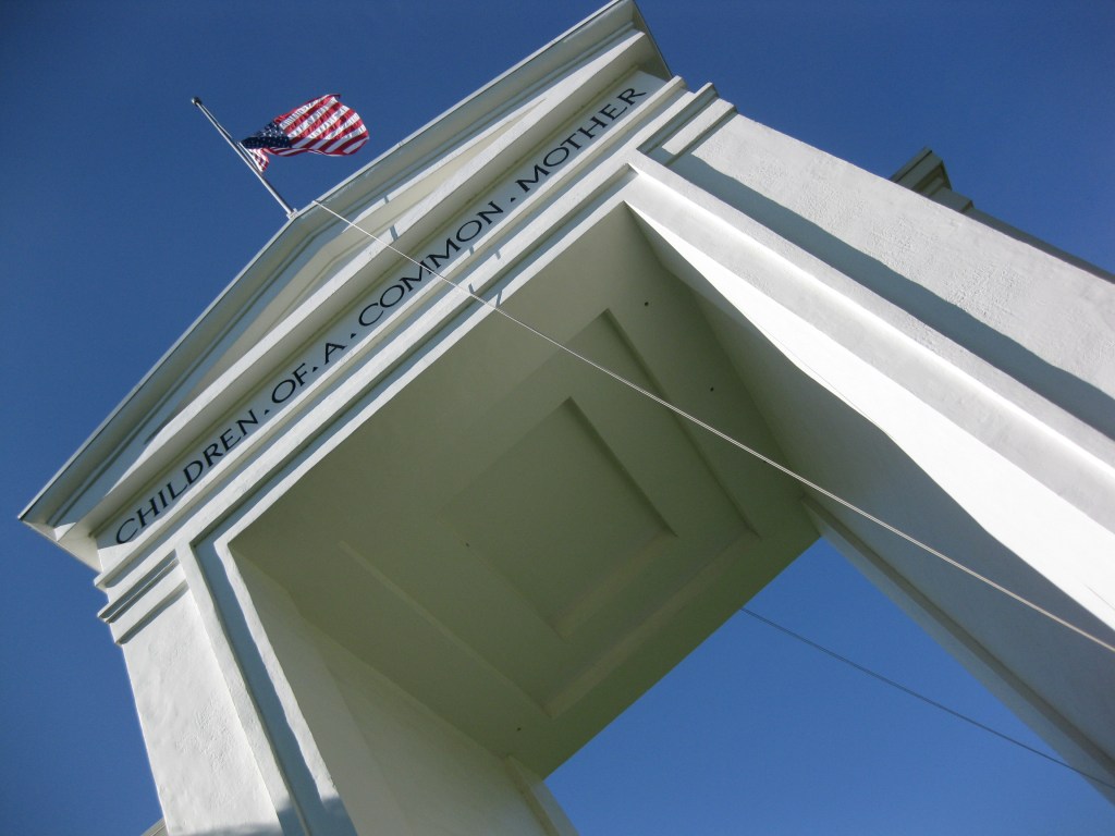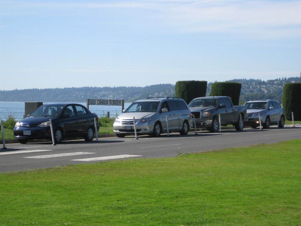 At the US/Canada border there was a beautiful monument – the Peace Arch – painted white with the inscription: ‘May this gate never be closed’ and huge flags fluttering from the roof. The area was very attractive – by the broad expanse of calm, flat water of Semiahmoo Bay and landscaped with some nice municipal bedding – big flower Canadian and US flags.