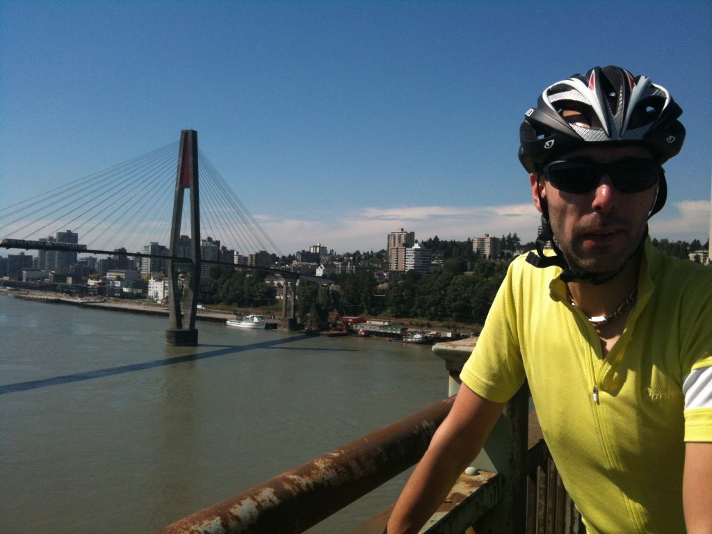 We continued our ride along the river on a cycle path – called Kent, past lots of timber yards into New Westminster, where we crossed the Fraser River over the Patullo Bridge.