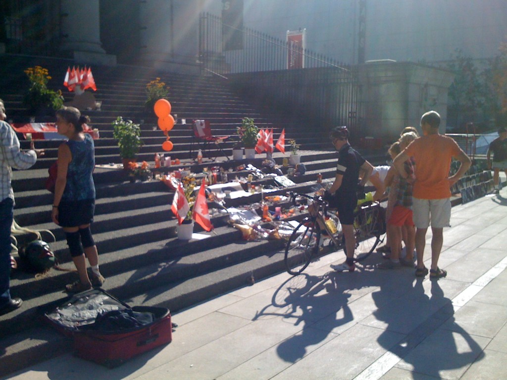 We passed a makeshift memorial to Jack Layton on the museum steps – he was the leader of the opposition in Canada who has recently died of cancer. It was very moving – letters and cards describing him as a ‘good man’, a ‘true socialist’, a ‘friend to immigrants’ and ‘best prime minister we never had’. Flowers and candles and balloons cascaded down the steps. On a nearby lamp post, a poster celebrating gay marriage in Canada – only the fourth country in the world to provide for this on an equal basis. This all helped us feel very much like this was a city that we were welcome in.