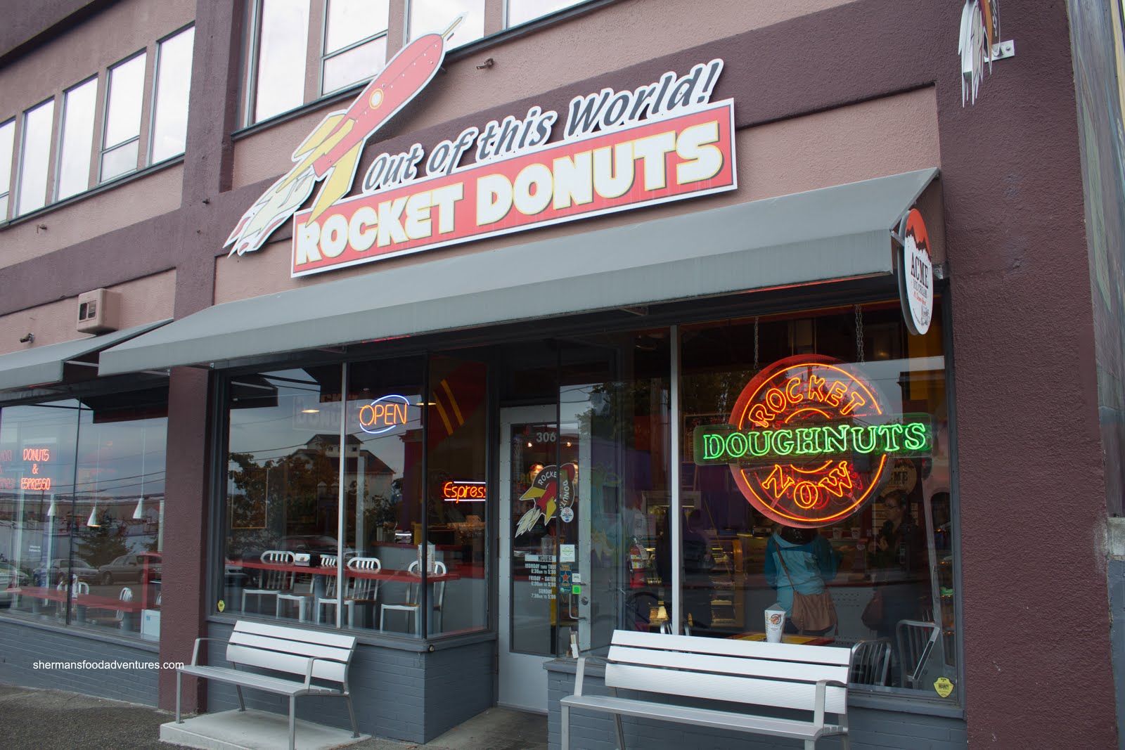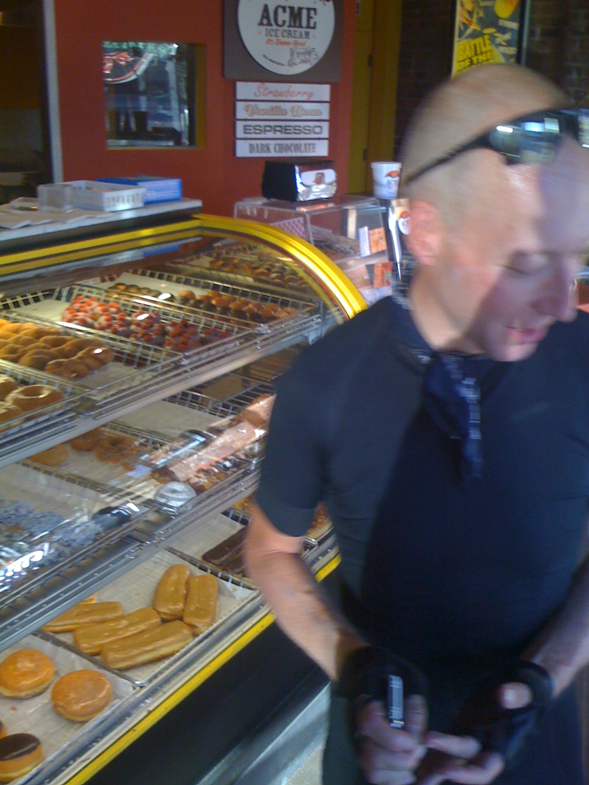 We had a break in Bellingham – a lovely-looking old town hall, now a museum. Called in at Rocket Doughnuts – organic coffee for Mike and green tea for Matthew – plus a doughnut of course: vegan chocolate for Mike and a blueberry fritter for Matthew.