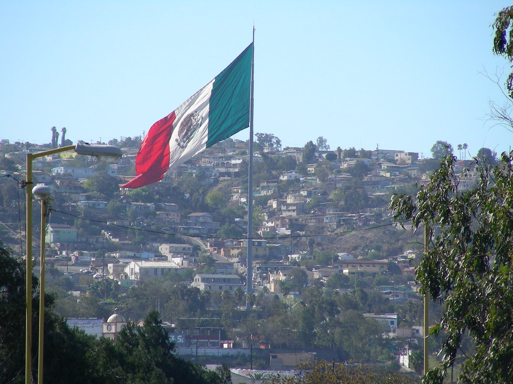We chatted all the way and it was wonderful to get to know someone who knew so much about the area. Isaac was a single parent of a nine-year old boy, (Grandma was looking after him today). Isaac works as an ophthalmologist, but he’s hoping to retrain as an advice worker and counsellor. We were cycling past lots of big white salt-extracting ponds when Isaac pointed ahead: “That’s Mexico!”, he shouted. Over a barbed-wire fence we could see a massive Mexican flag on a pole rising high above the buildings, with mountains behind. We were almost there!