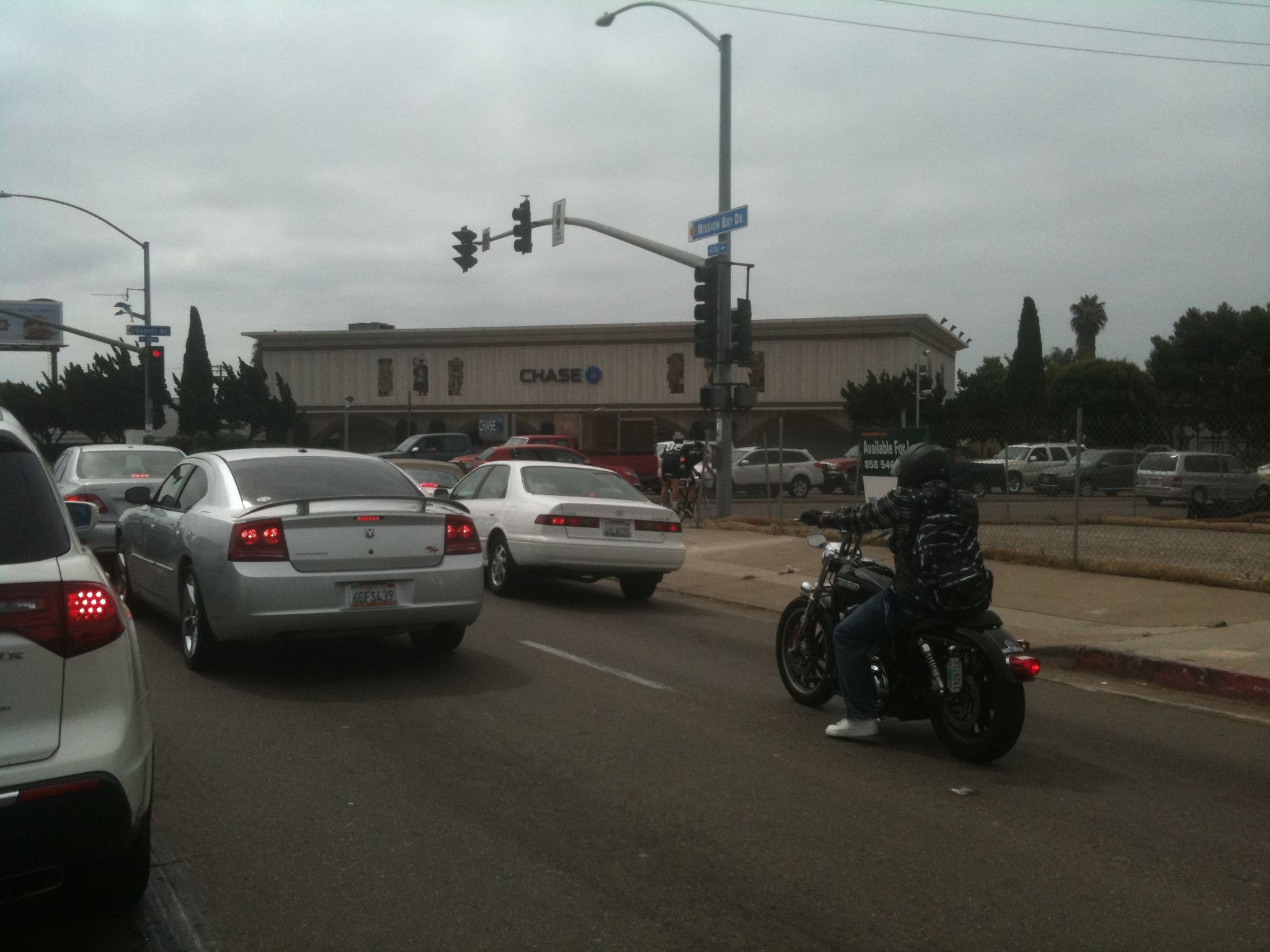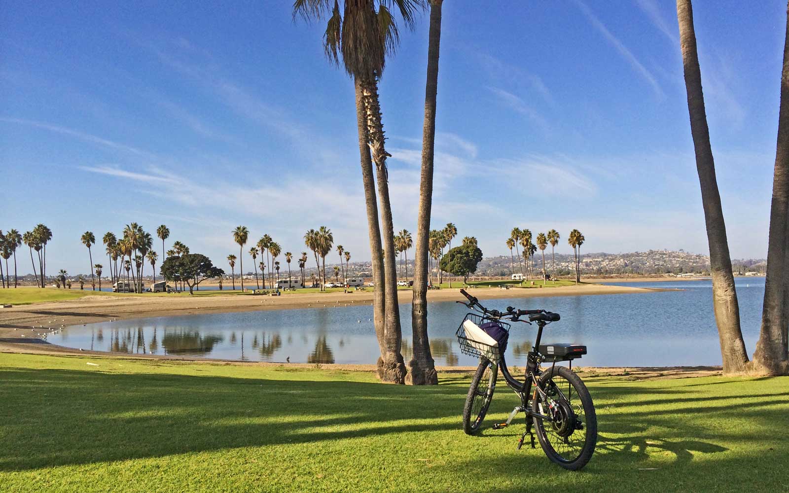 There was no let up in the volume of cyclists as we rode around Mission Bay Park, on yet another nicely-marked route. The park curves around a broad expanse of water. The whole place was very well used – in addition to cyclists, there were in-line roller-skaters, water skiers and people riding on little jetskis. Groups of families and friends were setting up gazebos and readying themselves for picnics, children were running about and playing – it was all rather wondrous.