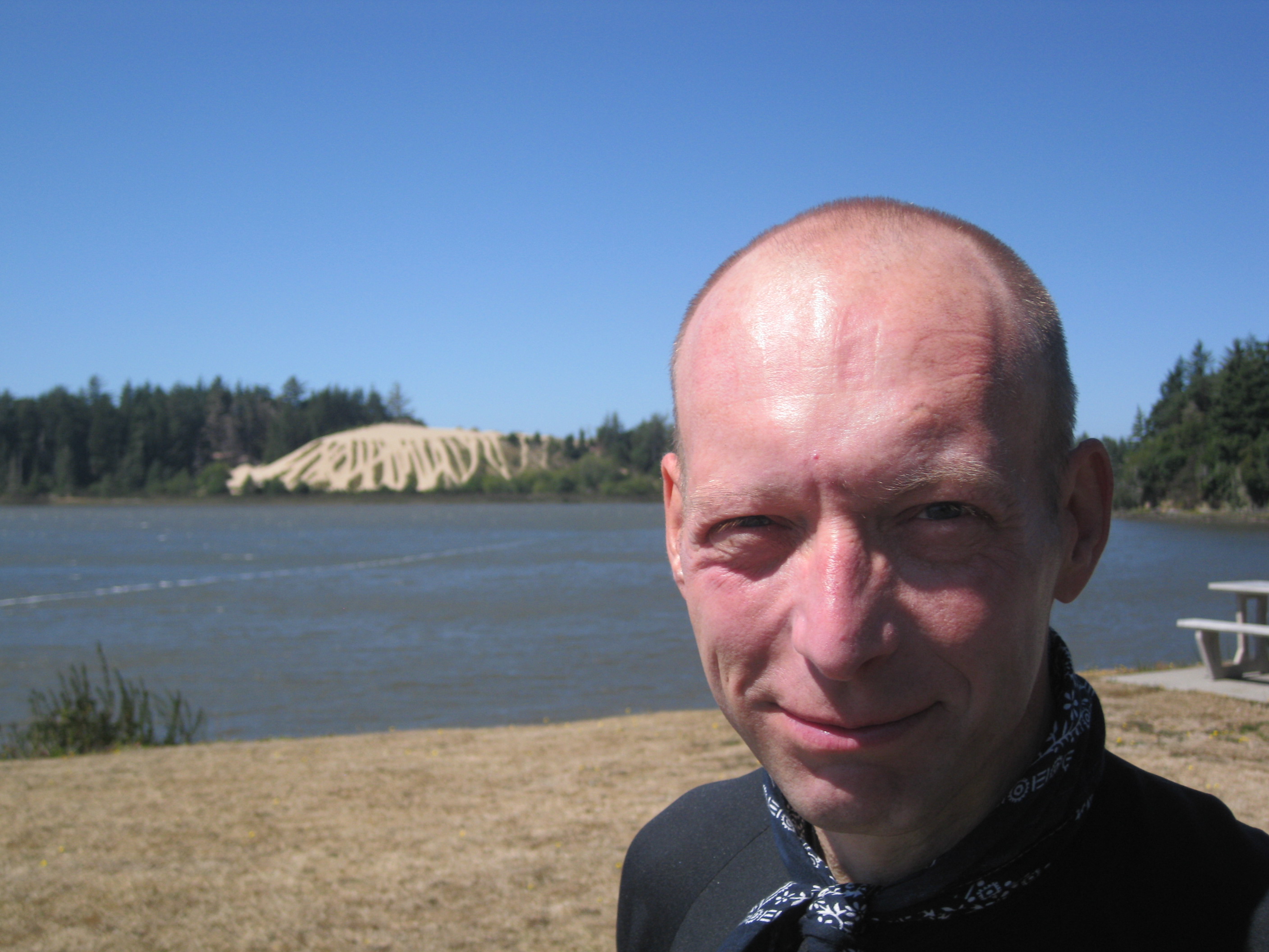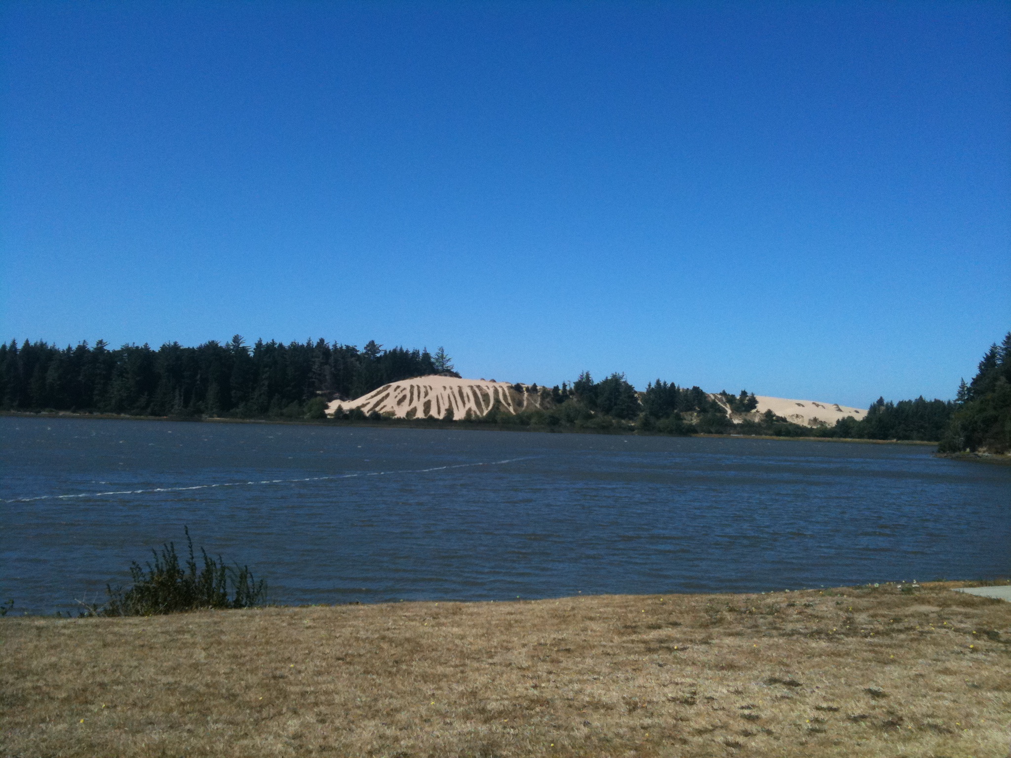 In the morning this route took us through the Oregon Dunes. I sometimes find that as an Englishman in America, I run out of superlatives to describe the things that I see … so much is beautiful, amazing, the most, the biggest, etc. Well the Oregon Dunes are difficult to describe – they’re huge! They must stretch for at least 40 miles and sometimes occupy a really wide area. They’re the biggest sand dunes that I think I’ve ever seen … some are 150 meters (500 ft) high (and I write as someone who’s been to the Sahara!) Occasionally a dune spills into the road and it was necessary for us to slowly negotiate our way around the massive drifts of sand spilling across the carriageway. The dunes are a popular attraction, and we could often hear the buzz of quad bikes in the distance. As well as towing boats, lots of cars here were towing trailers with fancy-looking quad bikes in them. Between the dunes, the roads were tree-lined with pines and there were quite a few inland lakes, making for a very pleasant morning’s ride.