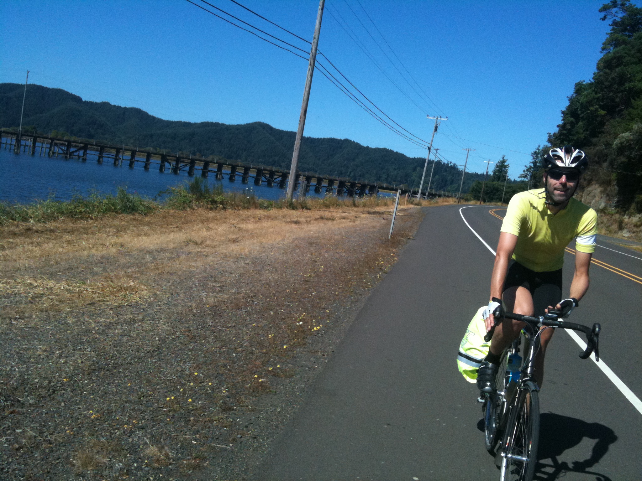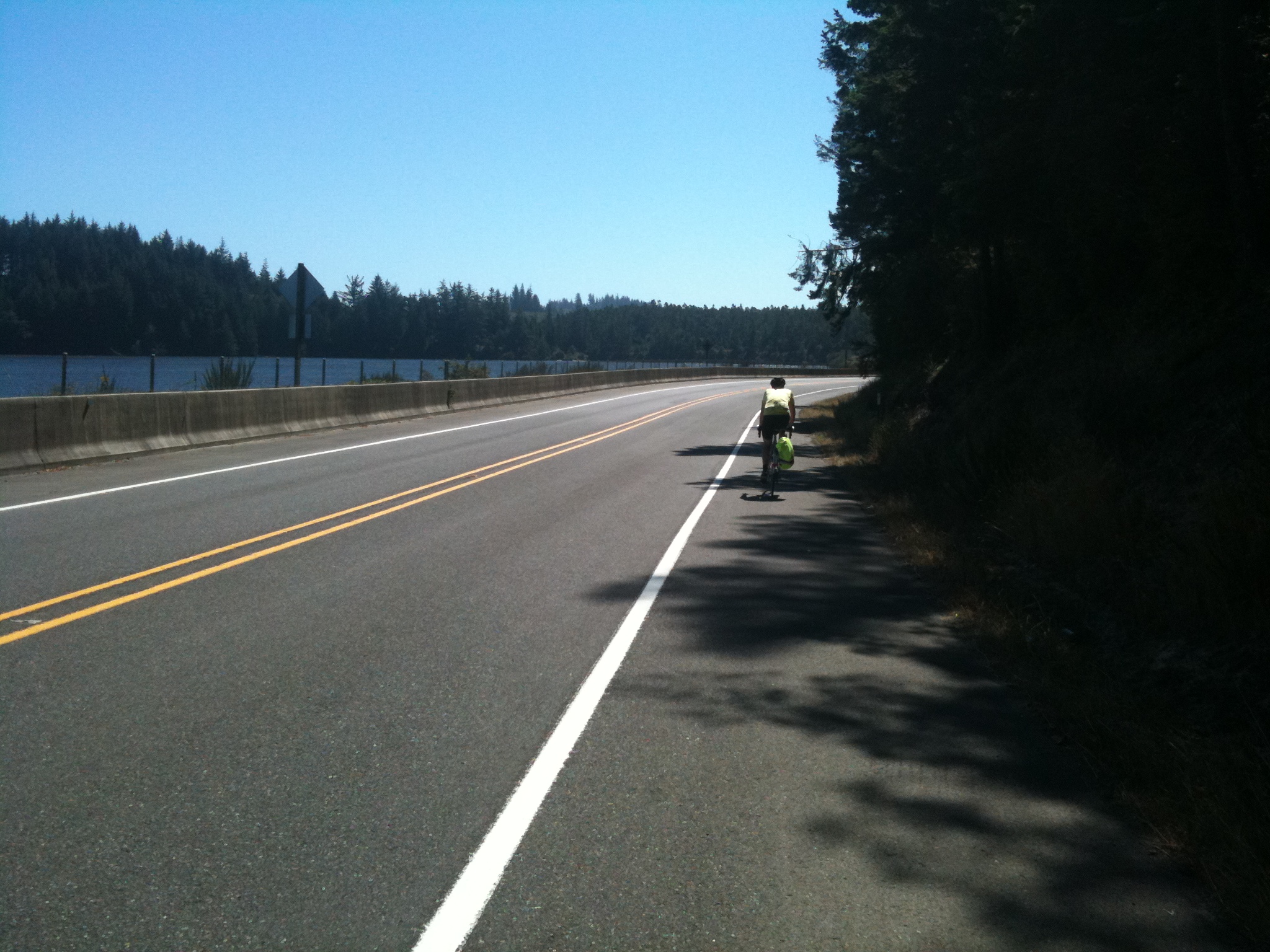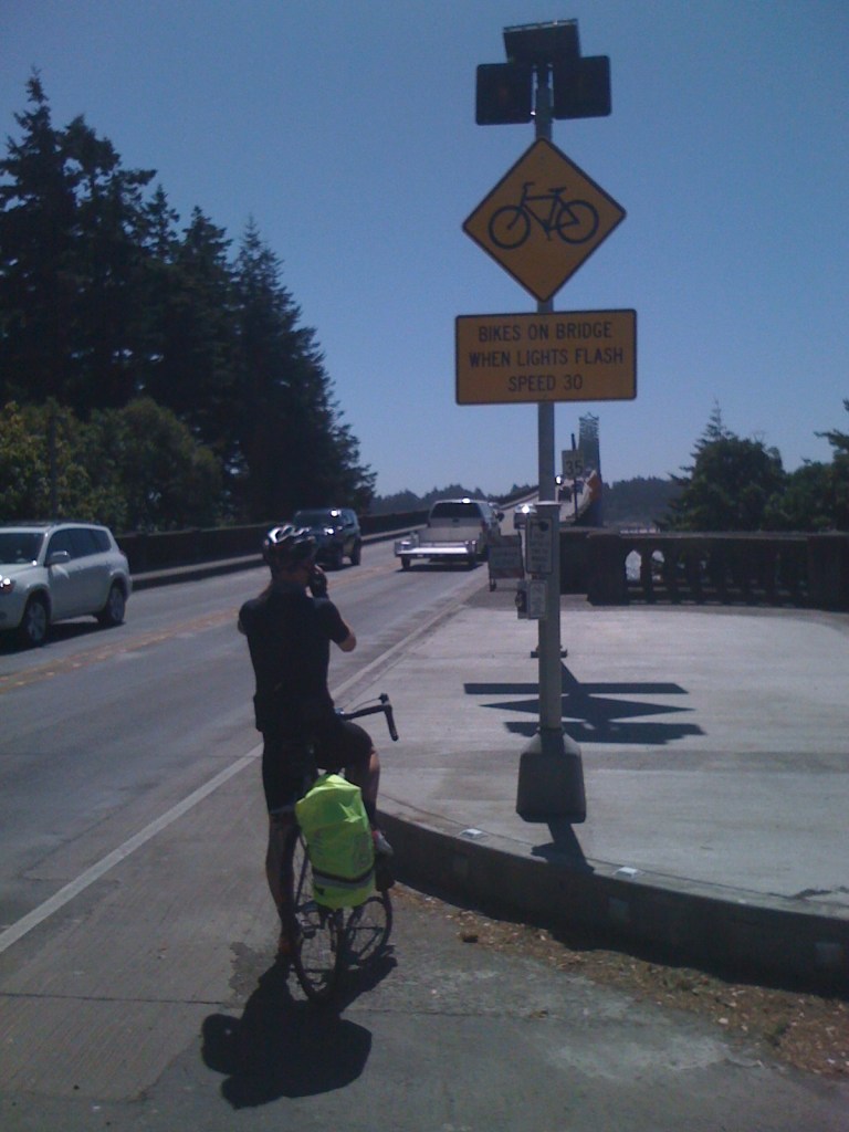 The Conde B. McCullough Memorial Bridge has a button at each end for cyclists to press, a bit like the one at the tunnel outside of Florence. The button sets off big flashing orange lights and reduces the speed limit on the bridge to (a still too fast) 35 mph. There are big signs for drivers warning of cyclists in the roadway. We approached the bridge rather nervously and pressed the button. To our surprise, delight and amazement a driver behind us in a big Winnebago slowed down to our cycling speed and kept well behind us all the way across the bridge. I wanted to hug him – and my ardour increased even more when we heard horns sounding from some frustrated drivers behind him who couldn’t see that we were on front – he just ignored them. When we came off the bridge we pulled over to wave to the driver and gave thumbs up signs. As the line of traffic streamed past us someone in a red car yelled some abuse about #*<$¥+•! bikes on the bridge. That spoiled things a little – cyclists are explicitly allowed on the bridge, it’s part of a state-wide official bicycle route and the next bridge upstream was miles away.