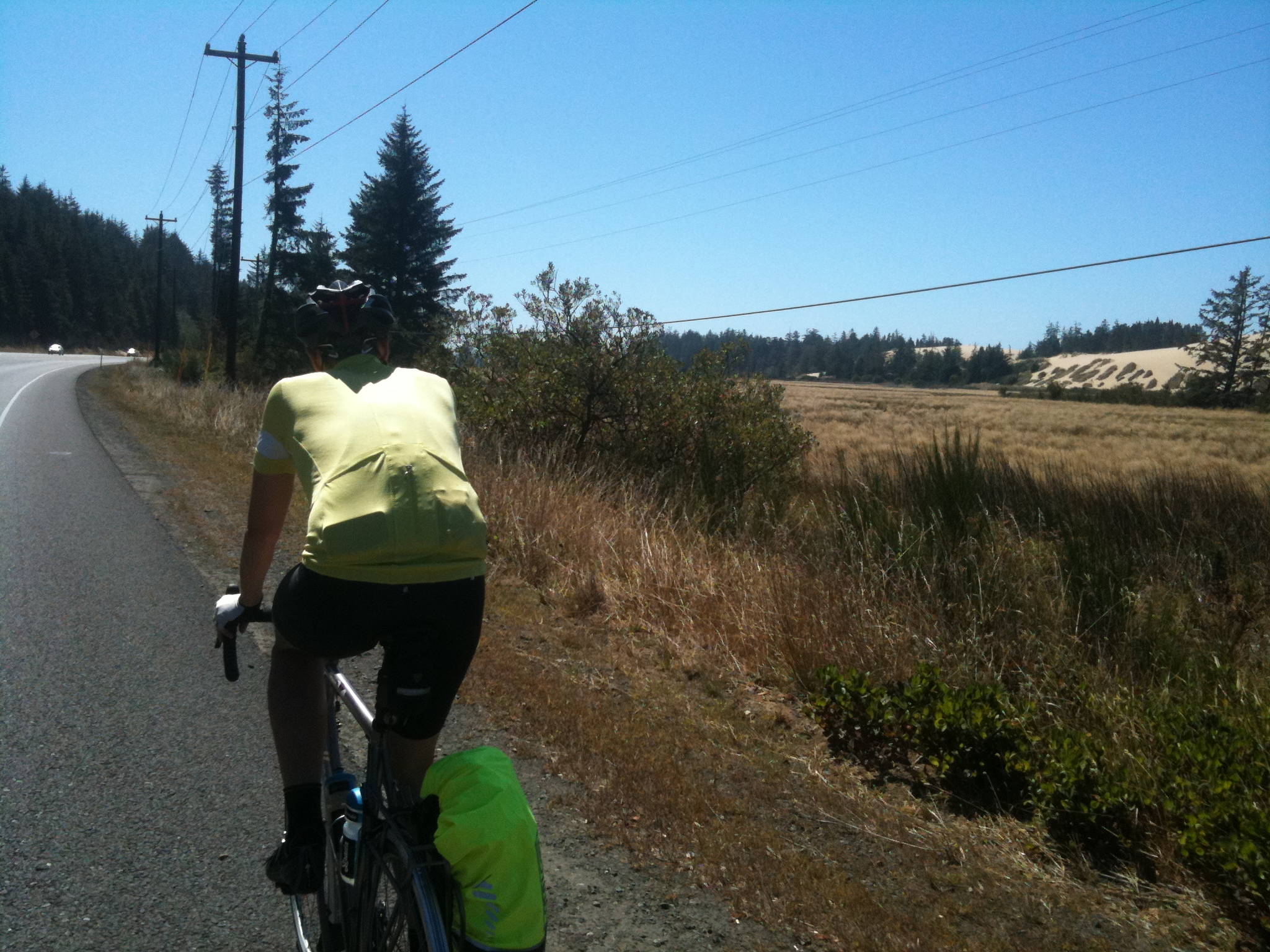 Cars in the USA are huge. Almost every one that passes is an SUV (the equivalent of Land Rover in the UK). Of course they’re fitted with all mod cons including air-conditioning – but who needs all that expense? As the temperature rises, the touring cyclists can take advantage of the free air-conditioner provided by mother nature. Not only do we get free air-con, we also get free air freshener in a variety of scents. We’ve had fantastic pine forest (think magic tree car air fresheners – but a million times better), ocean breeze (with real ocean), sand dune spray (with exfoliating sand) and cedar sensation (courtesy of the redwood trunks being transported by logging trucks along our route). It’s only a pity that there isn’t a ‘nose-press’ option on this blog for me to share these scents with you. I’m afraid you’ll have to use your imagination (or just visit the toilet cleaner aisle in your nearest supermarket for a very poor approximation!).