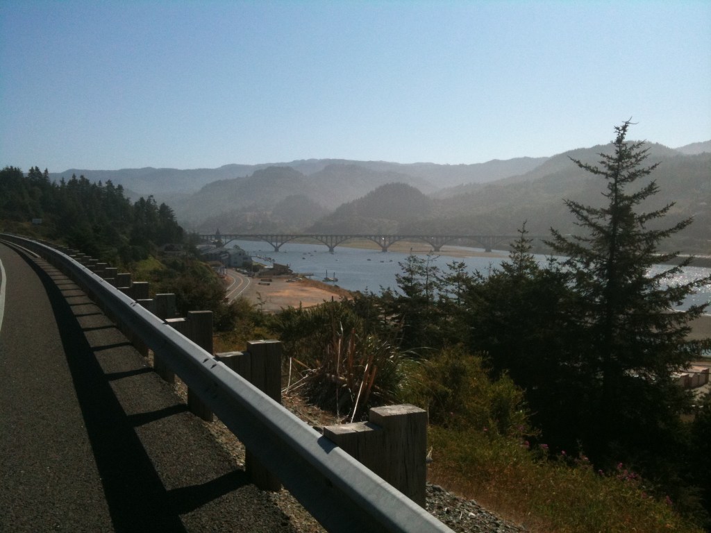 At McMinnville we turned onto Highway 18 and then passed through the Grand Ronde Indian Reservation – there were local election posters for seats on the Indian Council. Just after Willamina we changed to a much quieter route, the Little Nestucca River Road – it was stunning, we rode along a narrow, twisting, undulating road through the Nestucca valley. Pine trees, steep mountain sides giving way to open fields with grazing cows and fast-flowing streams cascading over waterfalls – it reminded us of Austria. The damp conditions are perfect for the moss that grows on almost all of the trees and branches. On some trees it grows so profusely that it hangs down like cobwebs – very dark green, quite eerie and beautiful at the same time. Matthew had read about these Oregon ‘rain-forests’, so to see them first-hand on such a lovely stretch of road was a bonus. We enjoyed a fantastic descent, crossing little single-lane bridges towards Highway 101 – the north-south coast road that we’ll be following now for most of the rest of our journey south.