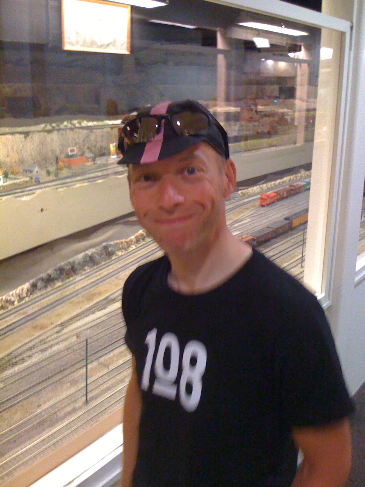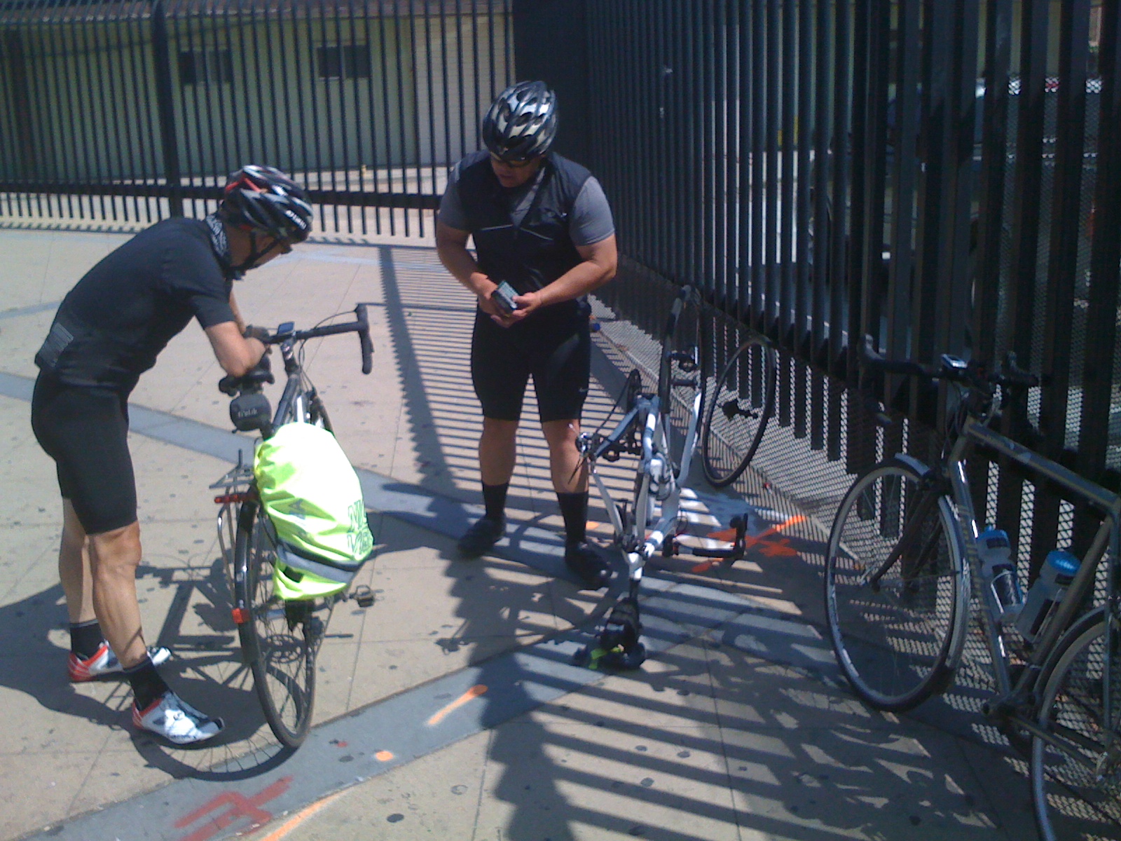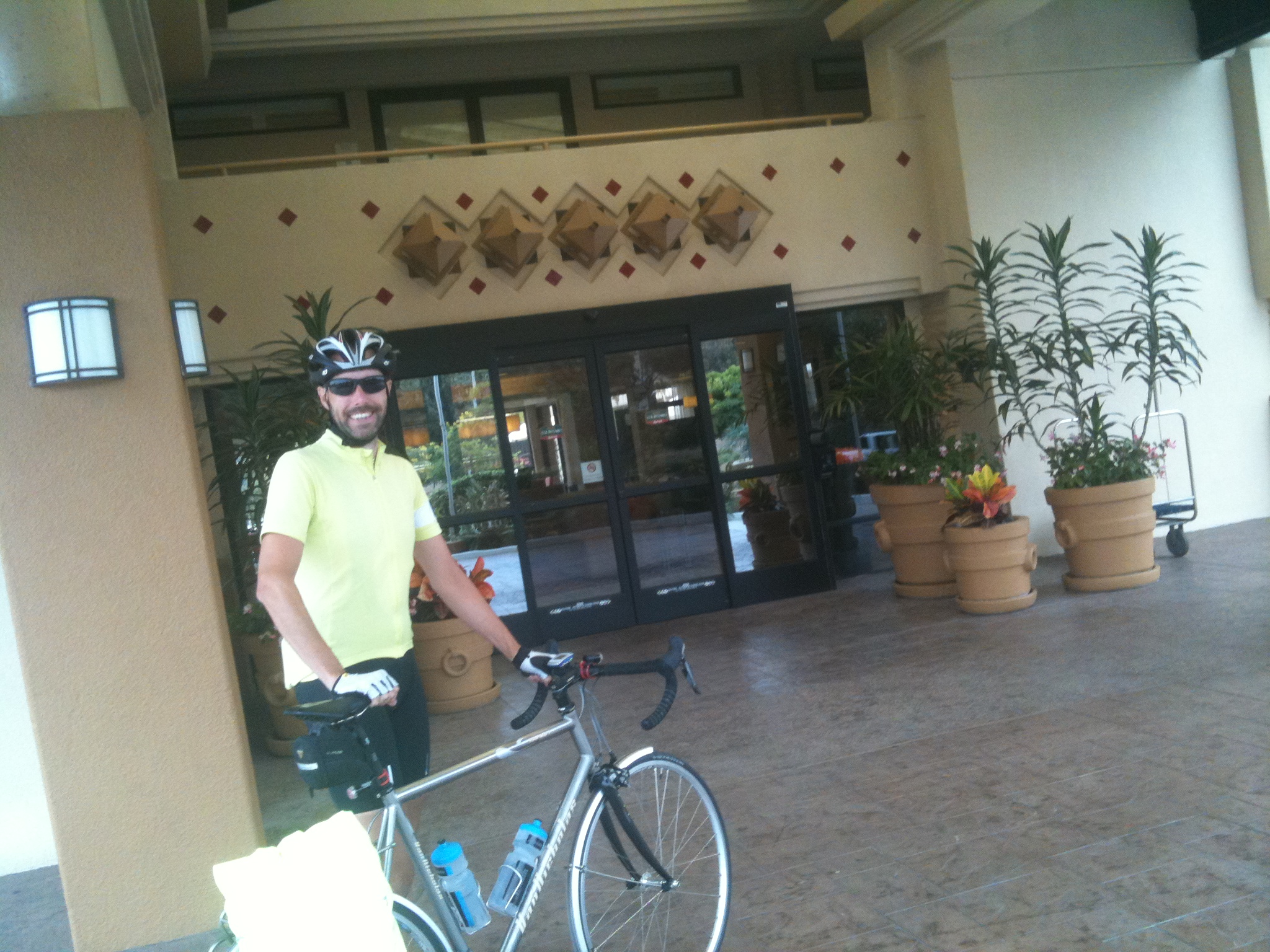 We needed to get on out way, so we took the metro from the LA civic centre back to our hotel. Before leaving earlier in the day, we’d checked out of our rooms and put out bicycles into a hotel store room. We retrieved our bicycles and cycling gear and went to the men’s ‘restroom’ to change into cycling gear. Mike first, then Matthew. While he was getting changed, Matthew ‘forgot’ to lock the cubicle door, (or so he later claimed). Picture the scene: Matthew, stark naked – apart from one sock – sitting on the toilet pan and putting on the other sock, when a man walks in on him. The man was a little bit surprised. I think that even in California, you could get arrested for hanging around nude in men’s toilets, (a smart US-style lawyer would obviously be able to argue that one sock isn’t nude).