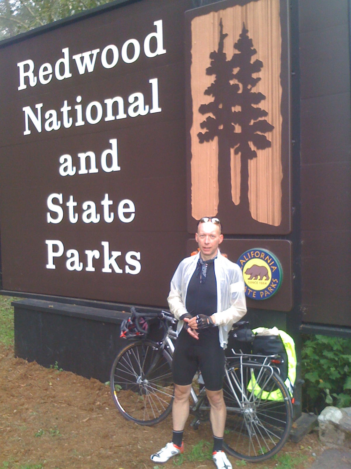 Today has been our longest day’s ride so far and the longest of our trip. 122 miles covered today from the foggy coast of north California to the sun-dappled giant redwoods. The final 30 miles were along the Avenue of the Giants – phenomenal, words can’t really describe how awesome these trees are. As it turned out, an unfortunate puncture (a thin piece of wire put three holes in the same inner tube), that held us up by about 30 minutes earlier turned out to be a blessing as it meant we had the avenue virtually to ourselves – hardly any cars at all. We were treated to wafts of cedar, pine and fennel that grows wild along the roadside wherever the sunlight gets through the trees. Tonight we’re sleeping amongst the trees in a wooden cabin – magical. If we weren’t both so sleepy after our long ride it would also be romantic!