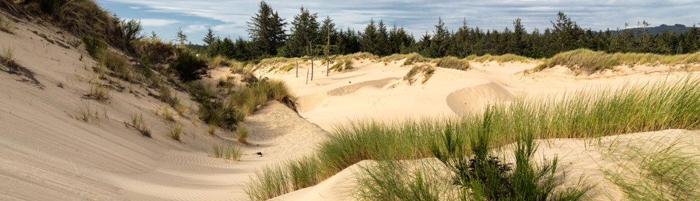 In the morning this route took us through the Oregon Dunes. I sometimes find that as an Englishman in America, I run out of superlatives to describe the things that I see … so much is beautiful, amazing, the most, the biggest, etc. Well the Oregon Dunes are difficult to describe – they’re huge! They must stretch for at least 40 miles and sometimes occupy a really wide area. They’re the biggest sand dunes that I think I’ve ever seen … some are 150 meters (500 ft) high (and I write as someone who’s been to the Sahara!) Occasionally a dune spills into the road and it was necessary for us to slowly negotiate our way around the massive drifts of sand spilling across the carriageway. The dunes are a popular attraction, and we could often hear the buzz of quad bikes in the distance. As well as towing boats, lots of cars here were towing trailers with fancy-looking quad bikes in them. Between the dunes, the roads were tree-lined with pines and there were quite a few inland lakes, making for a very pleasant morning’s ride.
