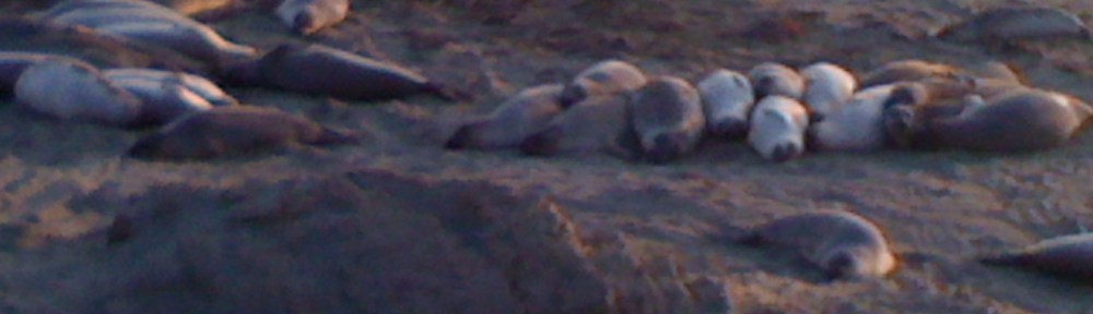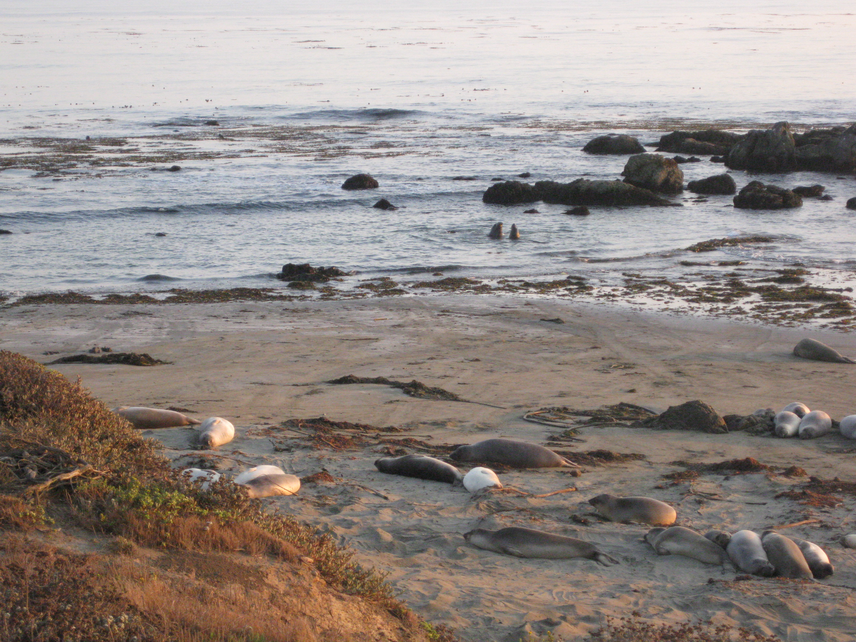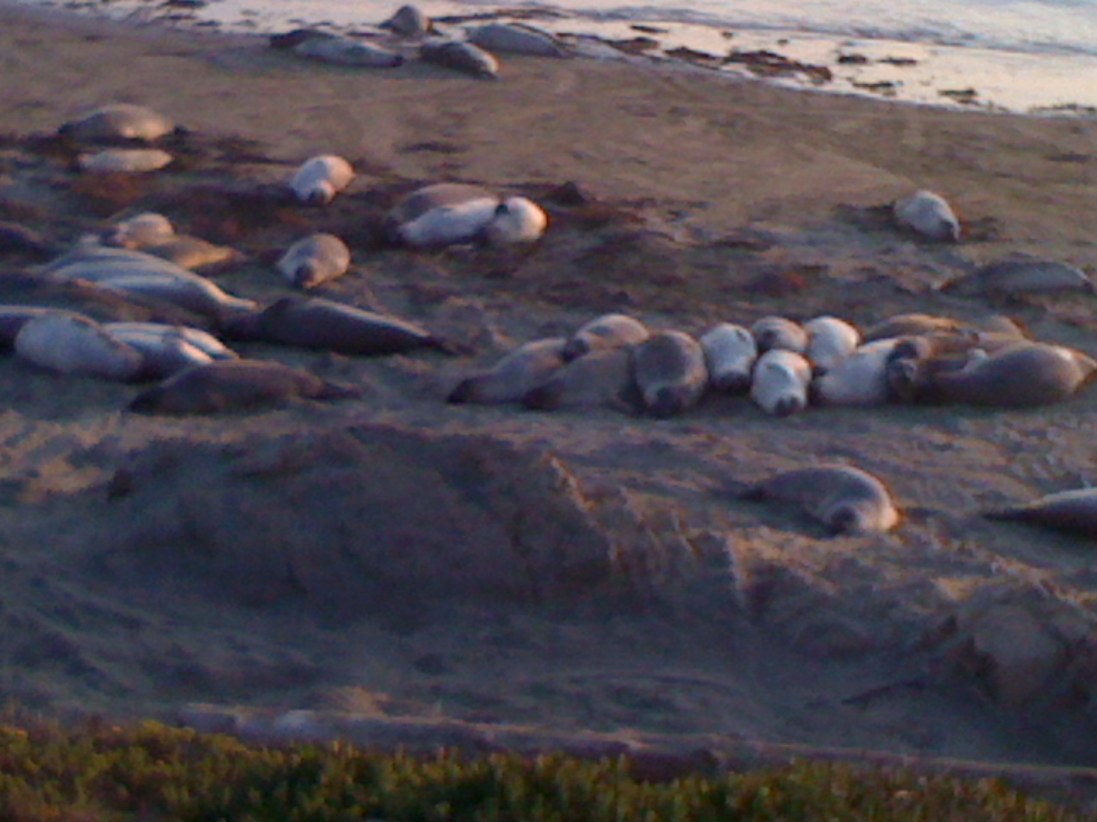 On some beaches to our right we saw several herds of elephant seals – absolutely amazing. They were honking and basking, using their flippers to flick sand over their bodies, pulling themselves along by their flippers through the sand or frolicking in the water with their bellies arched downwards so their noses and tails were both in the air. (Matthew has posted a video link). We could have watched for hours but, the full moon was already visible in the sky and there was a beautiful red/orange sunset over the Pacific.