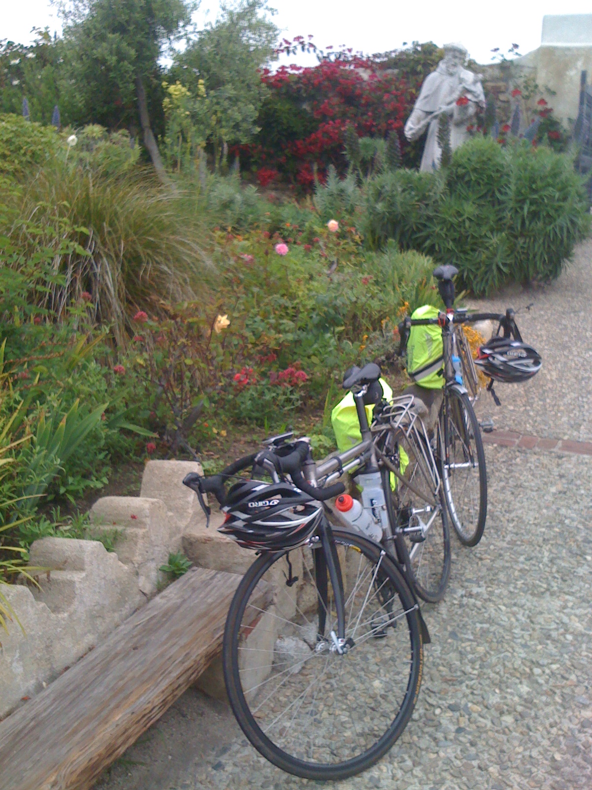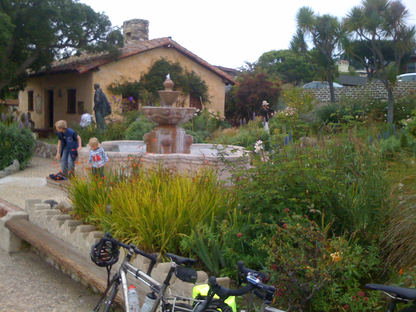 We cycled through the beautiful 17-Mile Drive, past trees that were just beginning to look a little autumnal with their leaves going orange and yellow. On into Carmel, a charming – but touristy little town. The one-time mayor of Carmel was one Clint Eastwood, whose central campaign theme was to have the ban on eating ice cream in public in Carmel lifted – you couldn’t make this up, could you?! Carmel has some very pretty detached bungalows with well-tended gardens and a bustling tourist-orientated centre. The whole place was actually a little too twee for my tastes and rather reminded us of Stow-on-the-Wold on a busy summer Sunday: art galleries, delis and coffee shops galore. Heaven help you if you need to buy something as mundane as a replacement fuse! Just on the edge of town, a lovely old stone church: Carmel Mission. It had really nicely kept gardens – there was a service going on, with singing, but we couldn’t really go into the church wearing Lycra cycling shorts (someone might faint), so we watched from the door for a while.