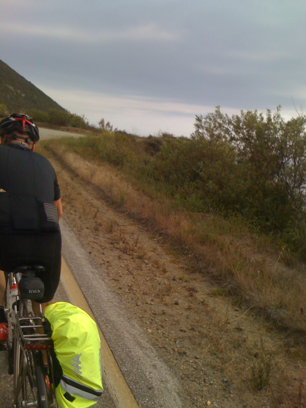 I was pretty worried about the time and I’ve been a bit concerned that on some days the end points that Matthew drew up mean that the distances are a little bit too challenging when combined with the fact that we’re carrying bags, the undulating terrain, an unremitting headwind or any kind of mechanical problem. We didn’t really stop for lunch anywhere and mainly relied on our shop bought oat energy bars, bananas and nuts.