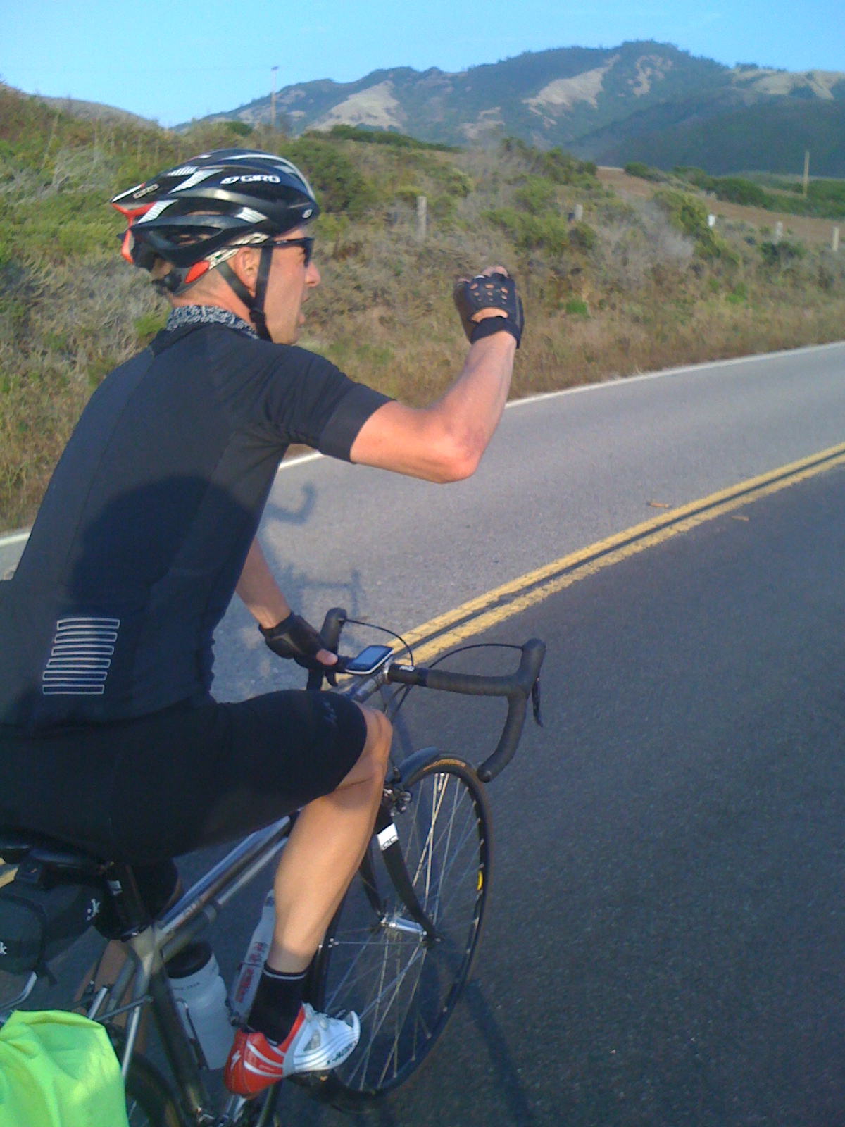 On to Big Sur – a spectacular section of Highway 1 along the Pacific Coast where the where the Santa Lucia Mountains rise abruptly from the Pacific Ocean. This section of the highway in a really remote and previously inaccessible area of the Californian coast was mostly built by convict labour in the 1930s. It must have been horrible work – the area is steep and undulating. It was challenging cycling up the climbs and negotiating the descents. The ride was tough today and the wind was still coming from the south, (although not nearly as strong as yesterday). Our difficulties were compounded by the fact that we are both still sore from yesterday. But it was worth it … too many Magic Moments of the Day to count.