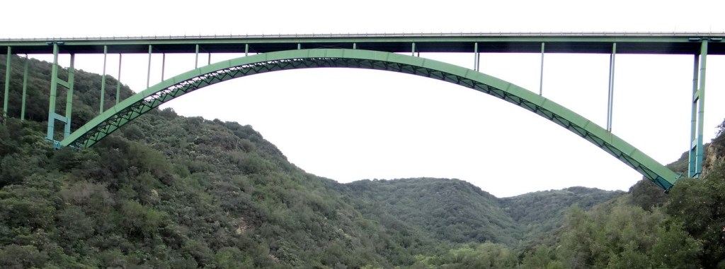 It was searingly hot as we headed out of town, even the wind was scorching. Joe had warned us that there was a big climb on the way to Santa Barbara. I thought, “Surely not, we’re heading to the coast.” Guess what? He was right (of course) and there was a HUGE UP AND OVER CLIMB to negotiate. It was just past Lake Cachuma in the Santa Ynez Mountains and through the San Marcos Pass on Highway 154. As well as being long, we were sweating buckets, as it was the middle of the day. To make things even worse, there was another super-scary bridge to negotiate. The Cold Spring Canyon Arch Bridge – a mere 370 m (1,214 ft) long and 128 m (420 ft) from the ground, (it’s a popular suicide spot apparently – 54 and counting and no-one has ever survived). I was not going to take a picture, I refused to look left or right, I just kept my head down and focused on the road in front of my wheel. Here’s what it look like: