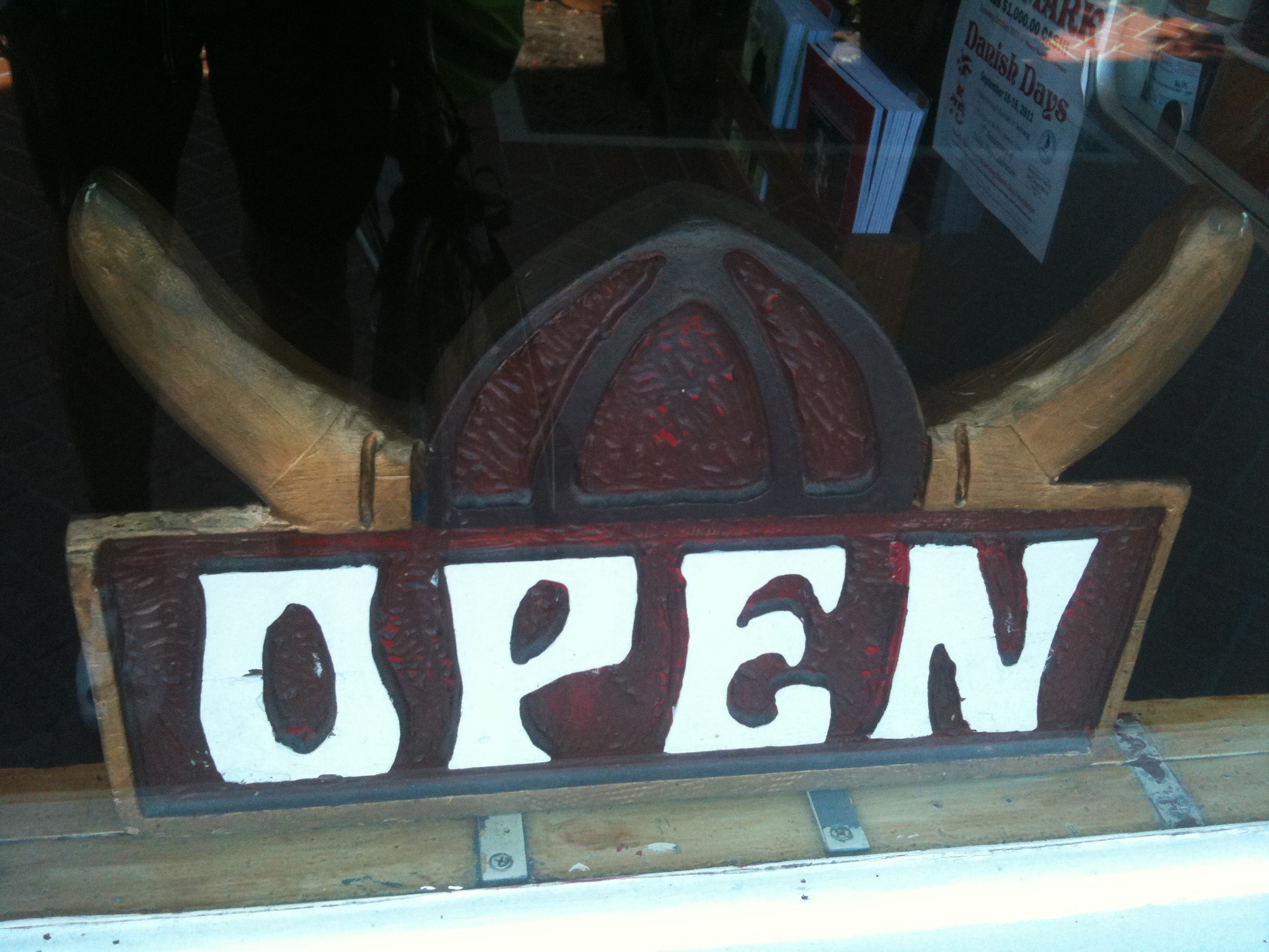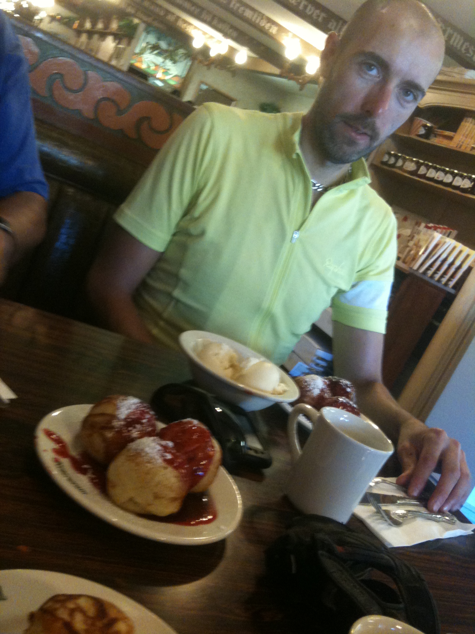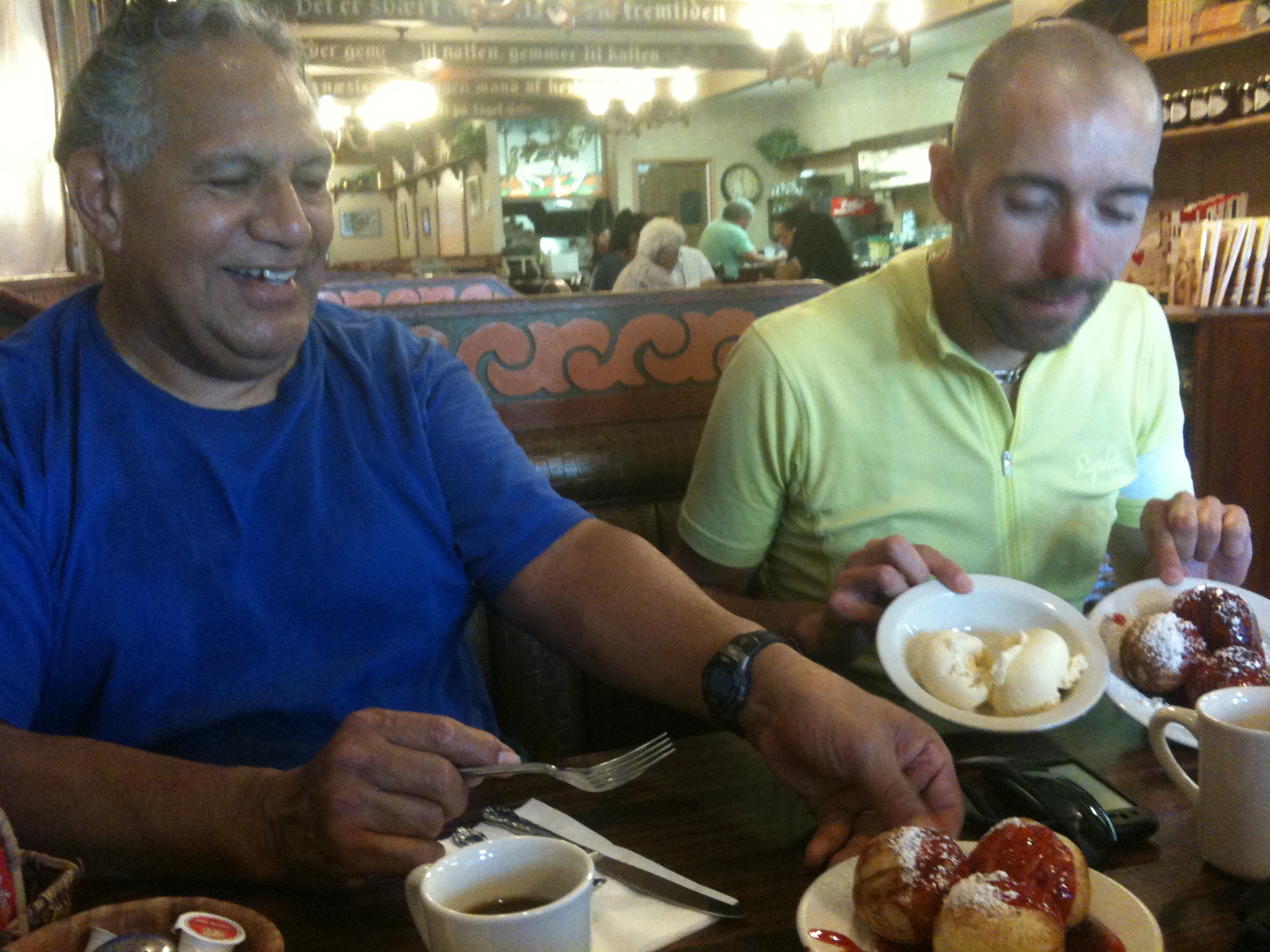 We mooched around Solvang for a bit and bumped into Joe again! We were looking at the Danish pastries, (of course). Joe recommended that we try aebleskiver, a Danish delicacy available in several of the restaurants. Supposedly invented by some Dane back in history, aebleskiver are like a waffle or a pancake, but formed into a round, about the shape and size of a tennis ball and must be cooked in a special pan with ball-shaped hollows in them. The name rather suggests that they would have apple inside them … but they don’t. They were served with powdered sugar sprinkled over them and topped with raspberry jam. Matthew was offered ice cream with his, which he (too) readily accepted. I asked for a plain one … little knowing that this would mean mine would arrive without any sugar or raspberry jam! So in the picture is my ‘wholesome’ aebleskiver, Joe’s conventional aebleskiver and Matthew’s extravagant aebleskiver. Sums us up, really, I think.