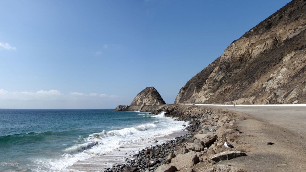 Between Point Mugu and Malibu we passed rocky cliffs with incredible folded rock strata and huge rectilinear blocks of stone strewn everywhere. We could could just make out people hiking up in the mountains in the far distance. The road itself ran along the water’s edge and huge blocks of black stone sloped down from the road into the sea to absorb the waves. There were warnings of rock slides every few hundred metres and people were working to try and stabilise the cliffs. The sea was calm, but the waves were breaking against the rocks and throwing spray into the air and onto the road. Inevitably, the road was incredibly deformed and breaking up. There were road works all along this section.