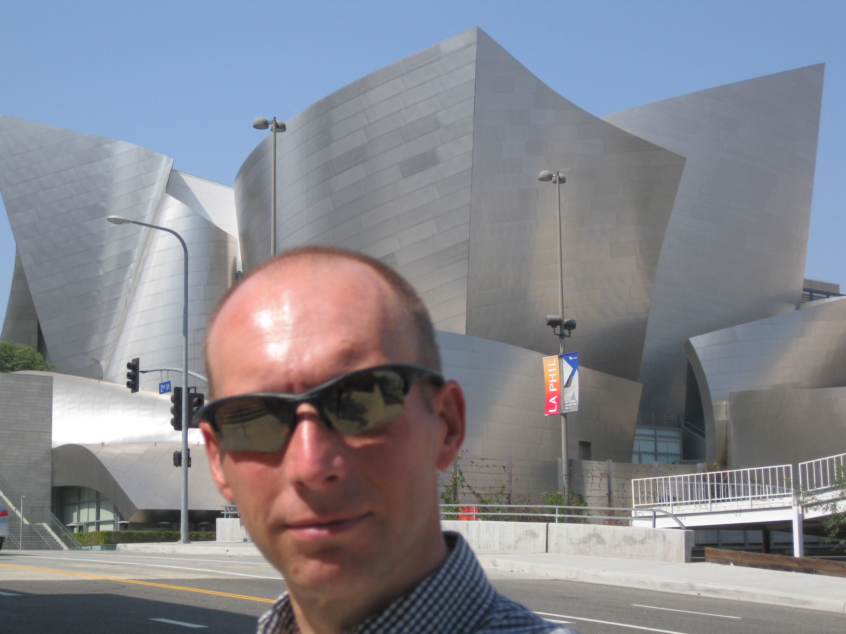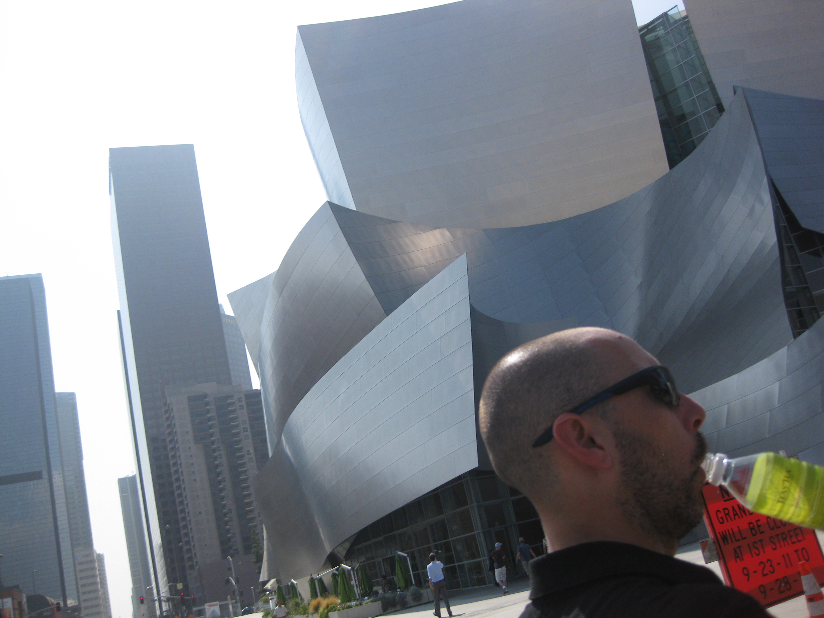We wandered through the Water Plaza with its extraordinary dancing fountains next to the tall skyscrapers. We passed MOMA and then visited the LA Music Centre, home of the new Walt Disney Concert Hall, the base of the LA Philharmonic. The building is amazing – designed by Frank Gehry and has the same look as the Guggenheim in Bilbao, all swooping and curving walls of shining metal. It’s beautiful. I wish that I could attend a concert there – especially with Gustavo Dudamel at the helm, but the new season hasn’t begun yet.