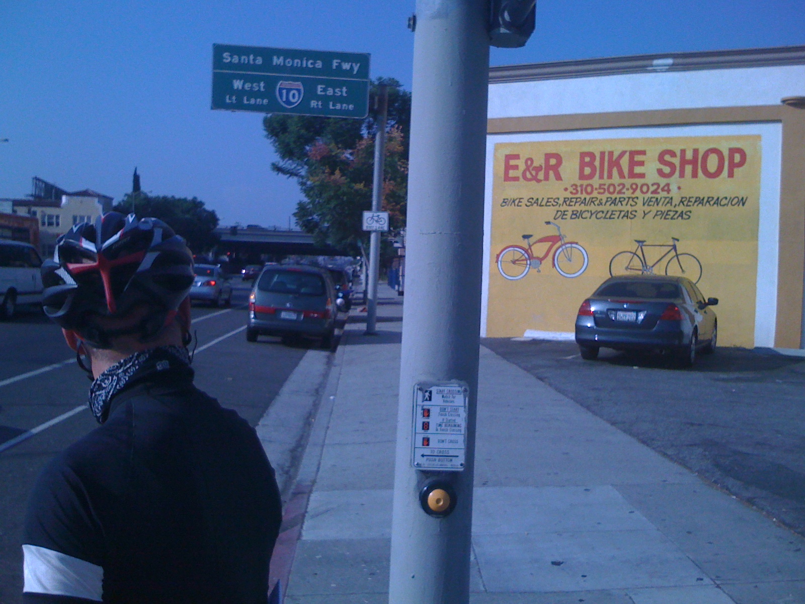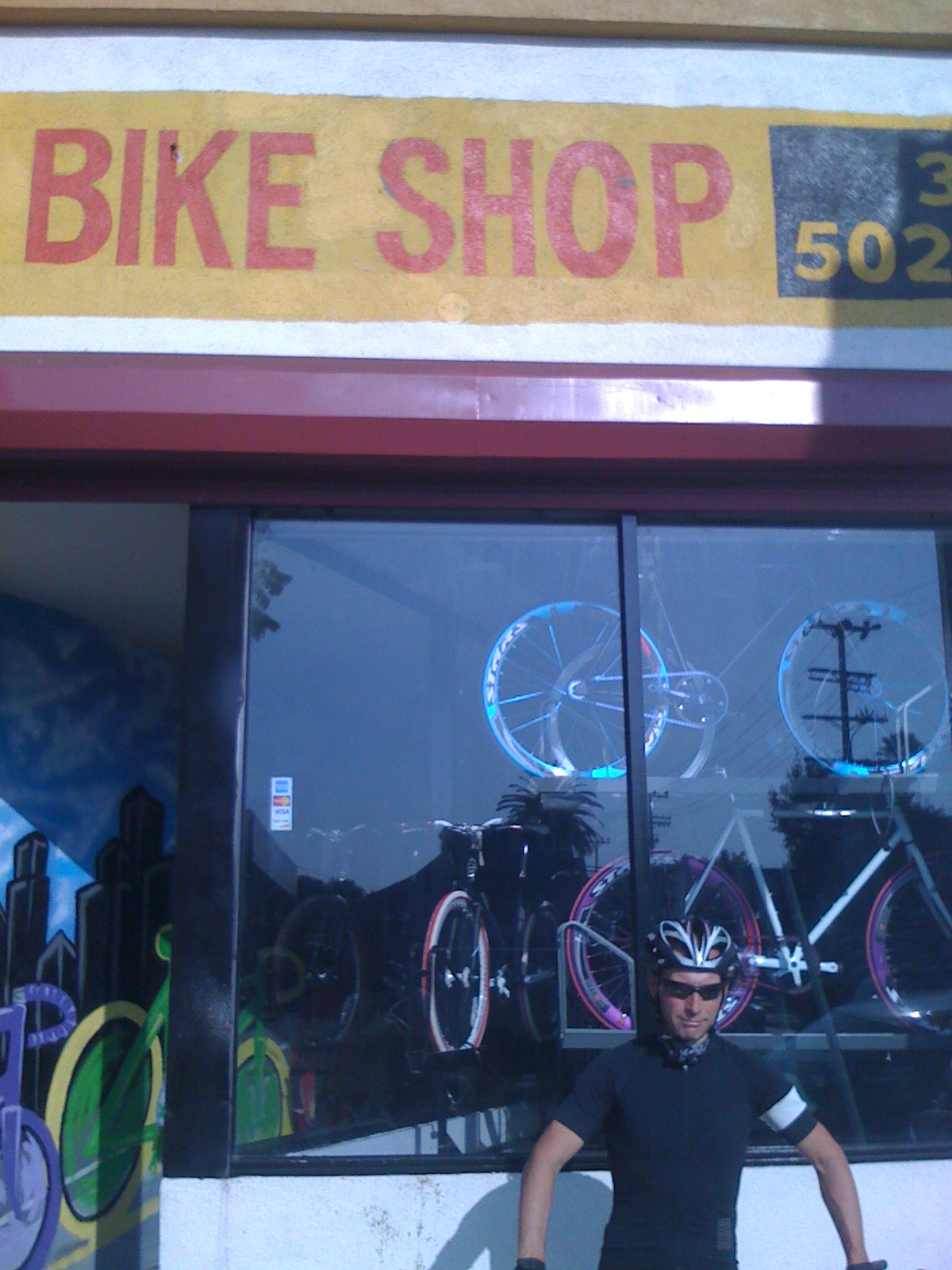 After yesterday’s various arguments, mishaps and other assorted debacles, we decided to take things as easy as we could today. We thought that one way of easing our path south through LA might be to pick up a bicycle map of the city and to speak with people in a local bicycle shop to listen to their advice on where best to ride in LA, and – perhaps more importantly – where to avoid. We looked up the closest bicycle shop to our hotel – it was almost 4 miles away, (this is LA) and we decided to take a bus.