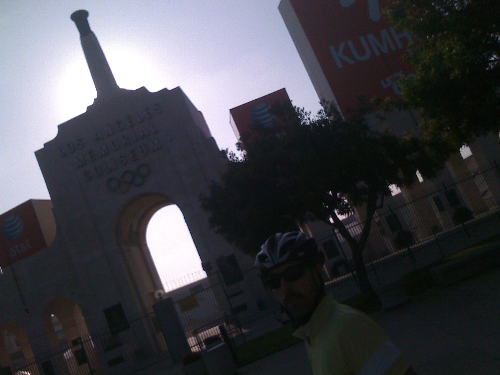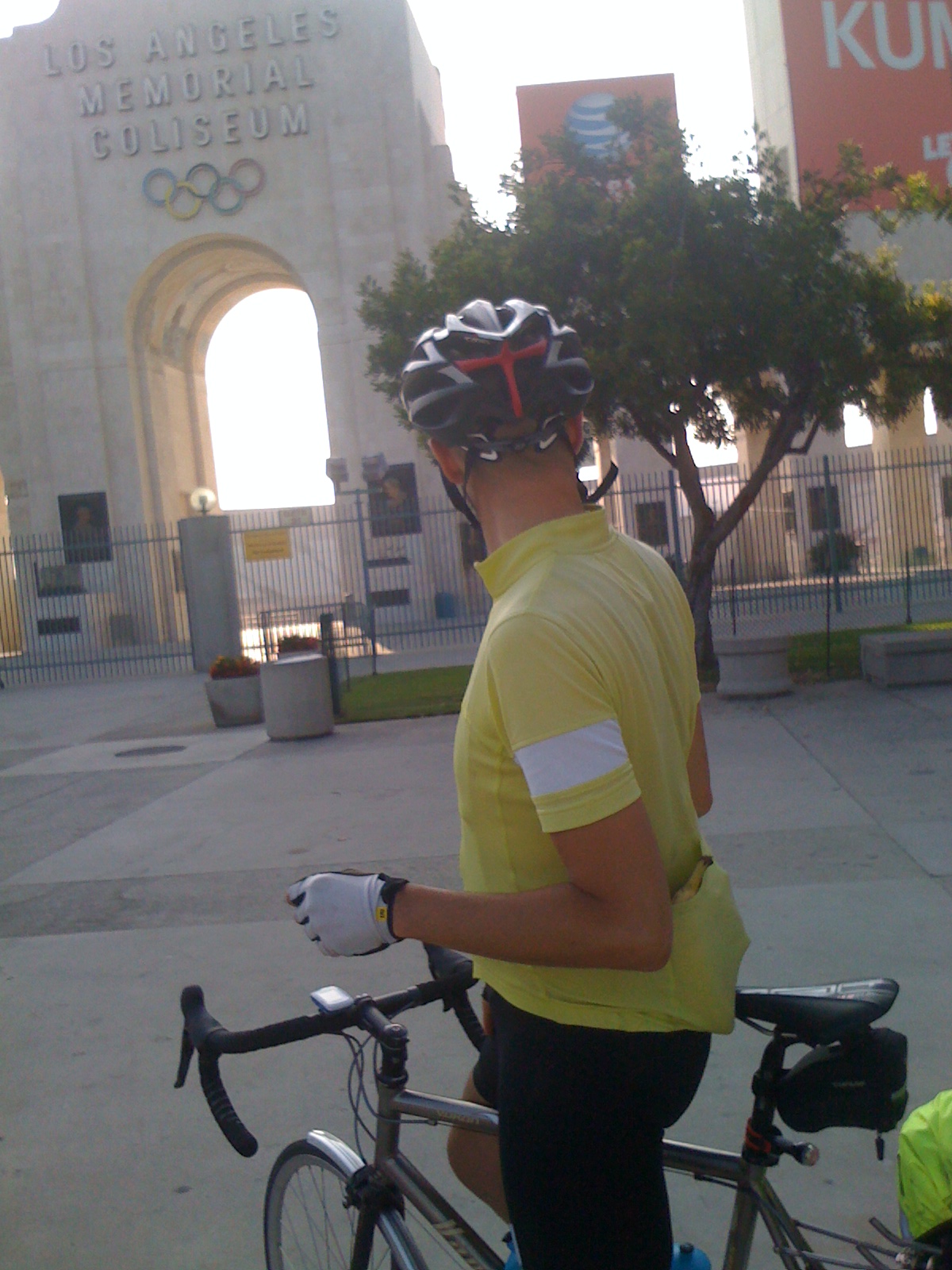 Our journey down Hoover brought us to the the University of Southern California campus. Students in the USA are back at college now, so it felt nice up be on such familiar territory. Lots of cyclists, of course. Just beyond the university campus was a beautiful rose garden, a science centre with aeroplanes attached to the wall, then to Matthew’s delight the stadium from the 1984 Olympics. Matthew has made comments about my boyish fascination with planes and trains. I can report that Matthew has a prodigious knowledge of – bordering on obsession about – past Olympic Games: which city in which year, (including winter), losing bidders, whether they made a profit or not and so on. His joy was unbounded to be at the stadium that made a huge profit after the financial disaster that was the Montreal Olympics in 1976, (the concept of profit or loss was irrelevant in Moscow in 1980 apparently). Pictures taken and we continued on our way.