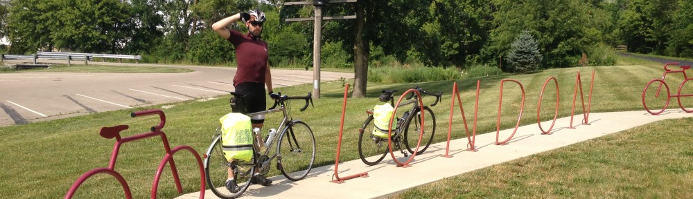 It’s been a British kind of cycling day today – first the customer service at the Dayton Grand was very British, (in a not very helpful sort of way) and not what we’re used to in the USA. Then we cycled through London, not our London clearly, but a very pleasant town just over halfway between Dayton and Columbus. It didn’t look very British – rather quintessentially Midwestern USA, lots of timber buildings with pretty porches, but they had a fab welcome sign as the trail entered town, we had to stop and take pictures. The thing that really made it feel British today though was the weather. It was in the 80s again for most of the day but at about 65 miles as we approached Columbus a storm broke and boy did it rain. Fortunately we had rain coats and lights so a quick stop to don those and we carried on. It’s always a bit nerve racking riding in the rain after a long warm spell a) the roads can be quite slippy so you can fall over and b) often bits of glass and metal get floated to the surface making punctures much more likely. We were lucky that neither happened. The rain continued pretty much all the way to Columbus but unlike British rain it was very warm and so a bit like cycling in a warm shower. I did ponder stripping off and doing a mini naked bike ride into town, but my British reserve kicked in and I refrained.