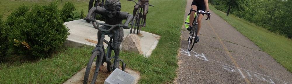 We joined the TJ Evans bicycle trail at Alexandria. The trail is adjacent to the Racoon Valley Road, (there were no racoons that we could see), and on in to Granville, where we watched a bunch of men and women doing boot camp exercises (sorry no picture – they were big!). We changed to the Cherry Valley trail – over a lovely light iron bridge that crossed a steam – and on in to Newark, passing an amusing cycling sculpture.