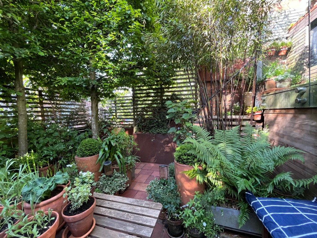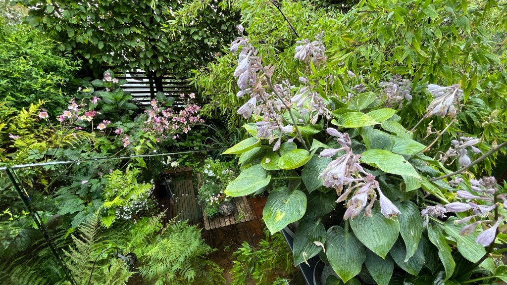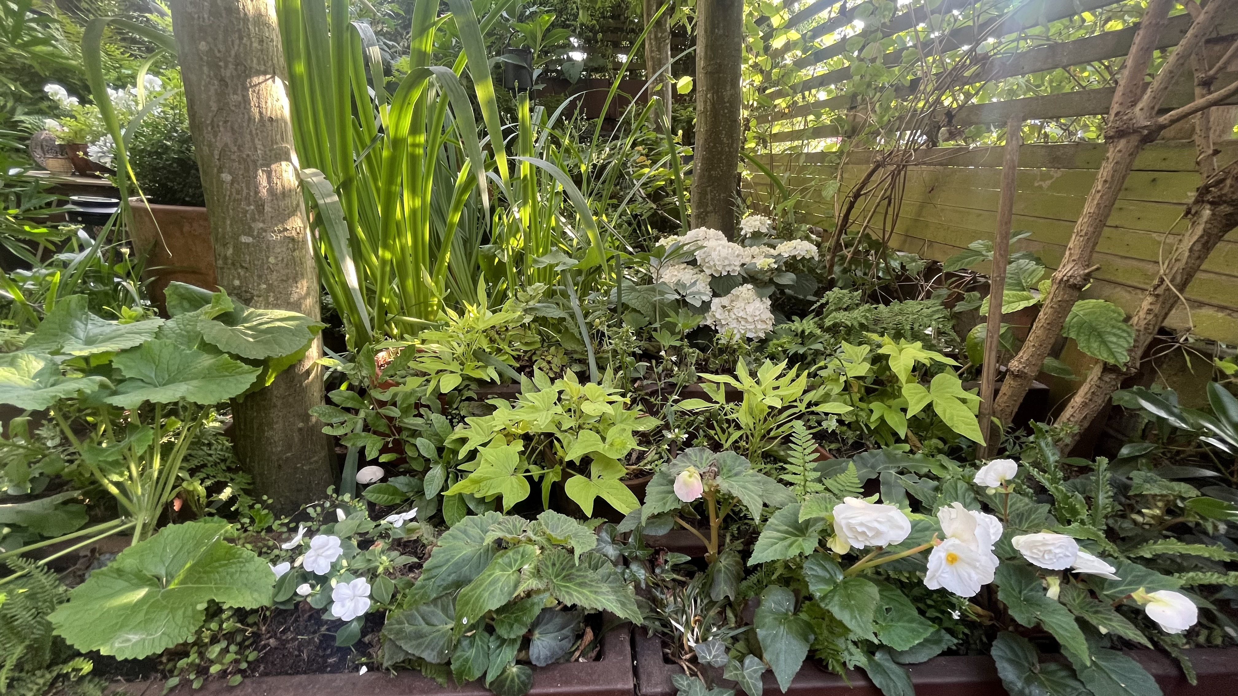 Three preached hornbeam trees provide privacy and a green wall. A raised bed and corten steel planters are full of lush planting with the occasional flash of white flowers. Every space is filled with plants including ferns, hydrangeas, anemone, hostas, hazel, bamboo, and roses. Wall topped planters squeeze in more planting space, and a environmentally friendly (but not very attractive) air-source heat pump is disguised beneath a shelf of potted plants. Even the water butt has a duel use hosting a potted water loving arum Lilly.