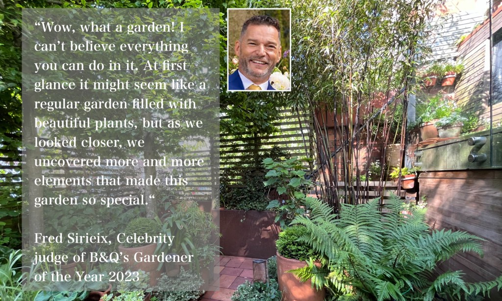 Even though it is tiny – little more than a yard-den (just 5.6m x 6.5m) there’s a sunny raised deck with glass balustrade allowing me to sit and view the garden from above and a shaded seating area for relaxing or alfresco suppers. A mini greenhouse for growing seedlings and tomatoes. A rectangular pond with a gentle waterfall provides calming sound and a haven for wildlife. There’s a smart bike store and lots and lots of plants too.